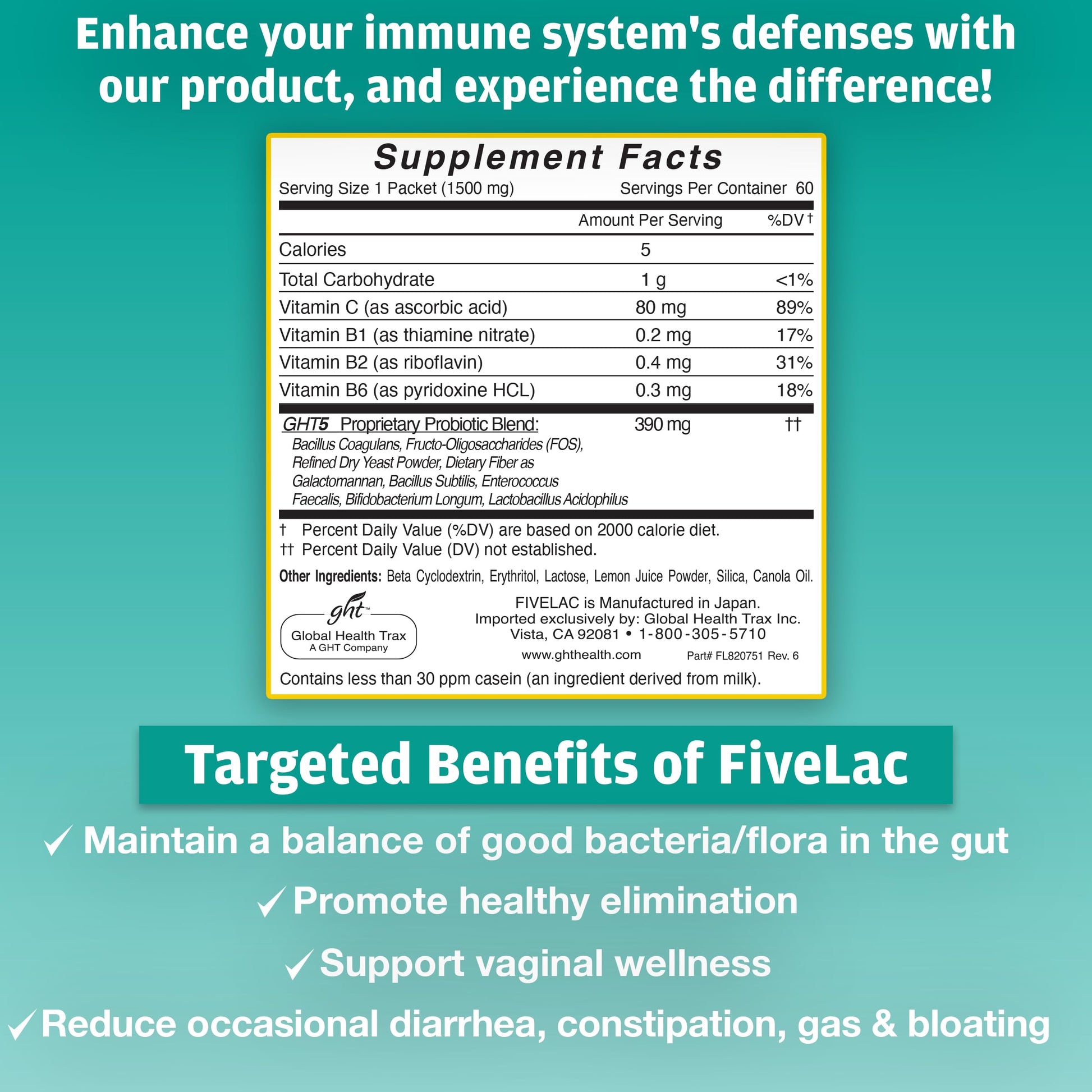 Global Health Trax GHT - FiveLac Lemon Probiotic Powder Drink Mix, Probiotics for Women, Men & Kids - Smooth Digestive Support & Elimination - Relieves Constipation & Gas - 60 Packets (2 Pack) Non-GMO