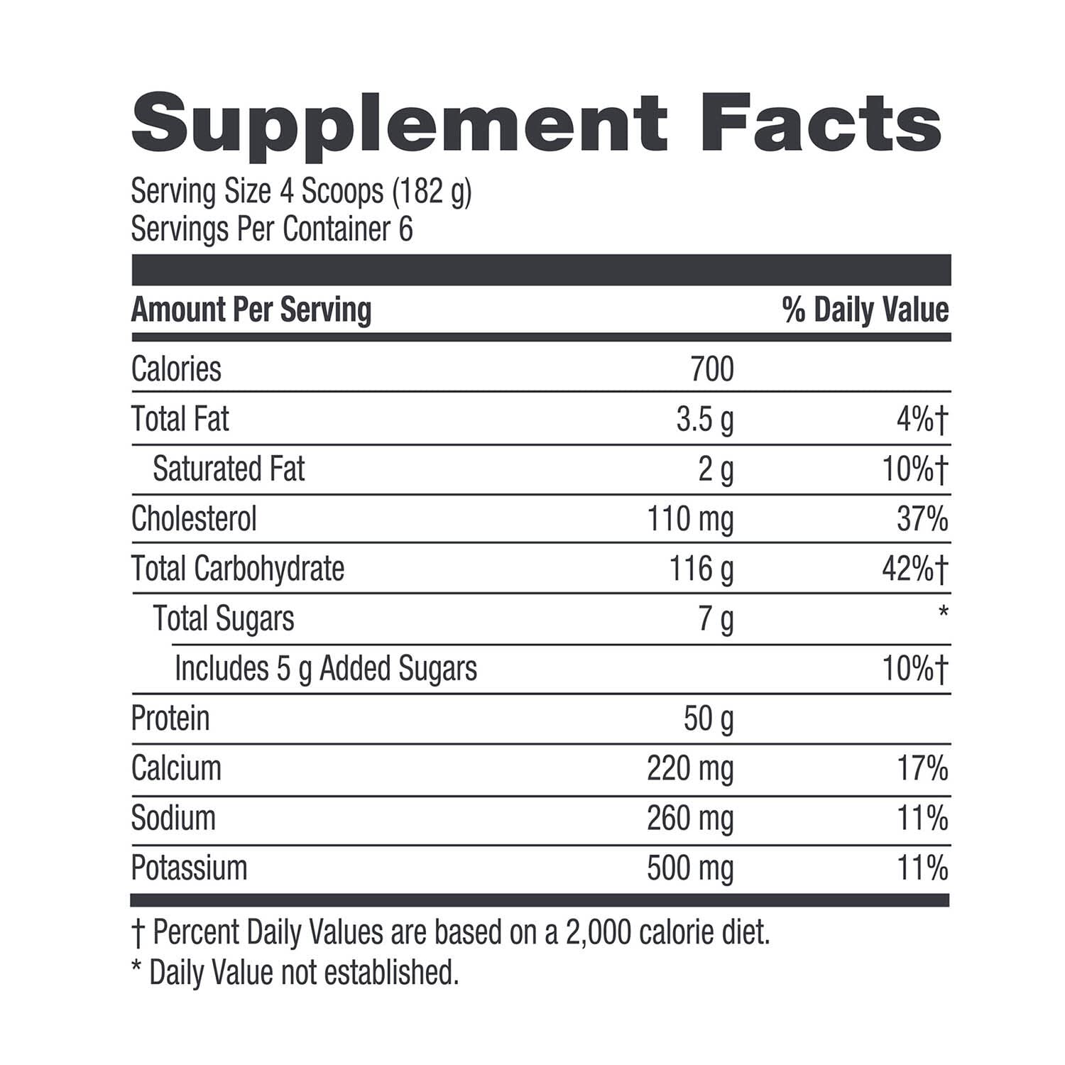 - POWER UP FOR A BIG DAY WITH 700 CALORIES: High-quality protein fuels muscles and 115-117g of a dual carbohydrate system preserves and replenishes energy stores.