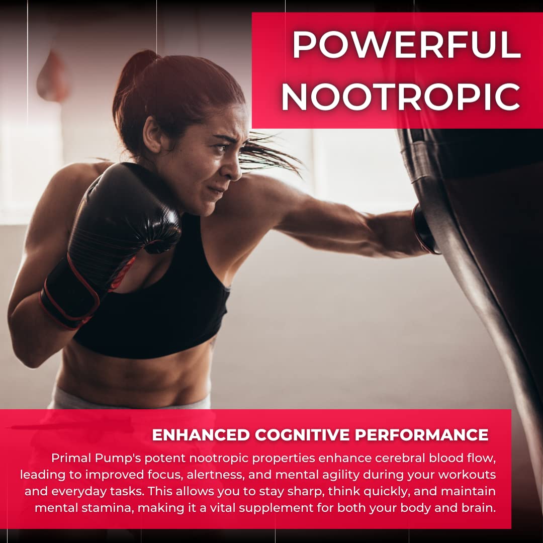 - Enhances Cognitive Performance: Alongside its physical benefits, Primal Pump is also a powerful nootropic. By boosting nitric oxide levels, it enhances cerebral blood flow, leading to improved focus, alertness, and mental agility during your workouts and everyday tasks. This allows you to stay sharp, think quickly, and maintain mental stamina, making Primal Pump a vital supplement for both your body and brain.