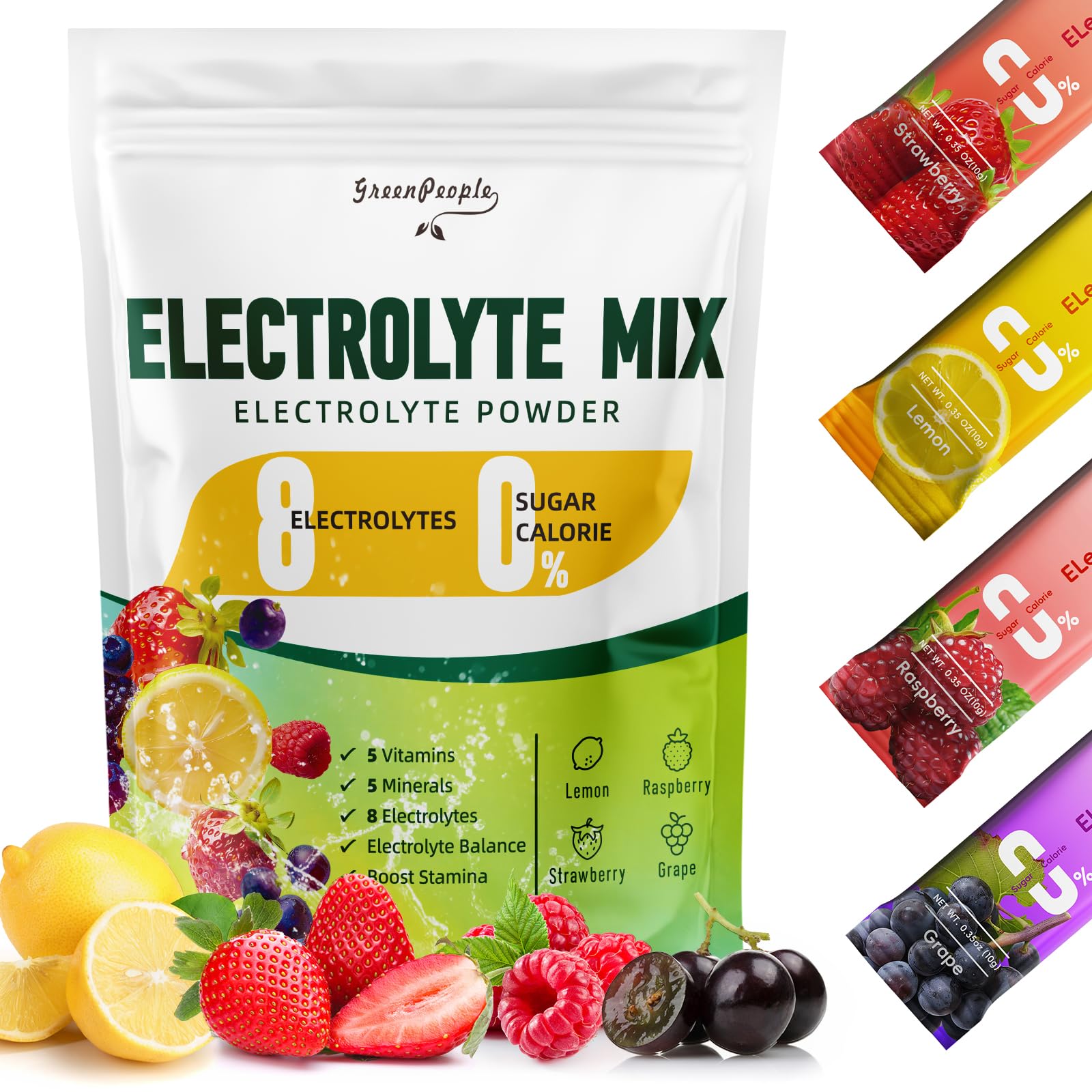GREENPEOPLE Electrolytes Powder No Sugar - Sugar Free Hydration Electrolyte Packets - Fruit Flavors Electrolyte Drink Mix - 8 Electrolytes 5 Vitamins & Minerals Vegan Non-GMO 16 Sticks