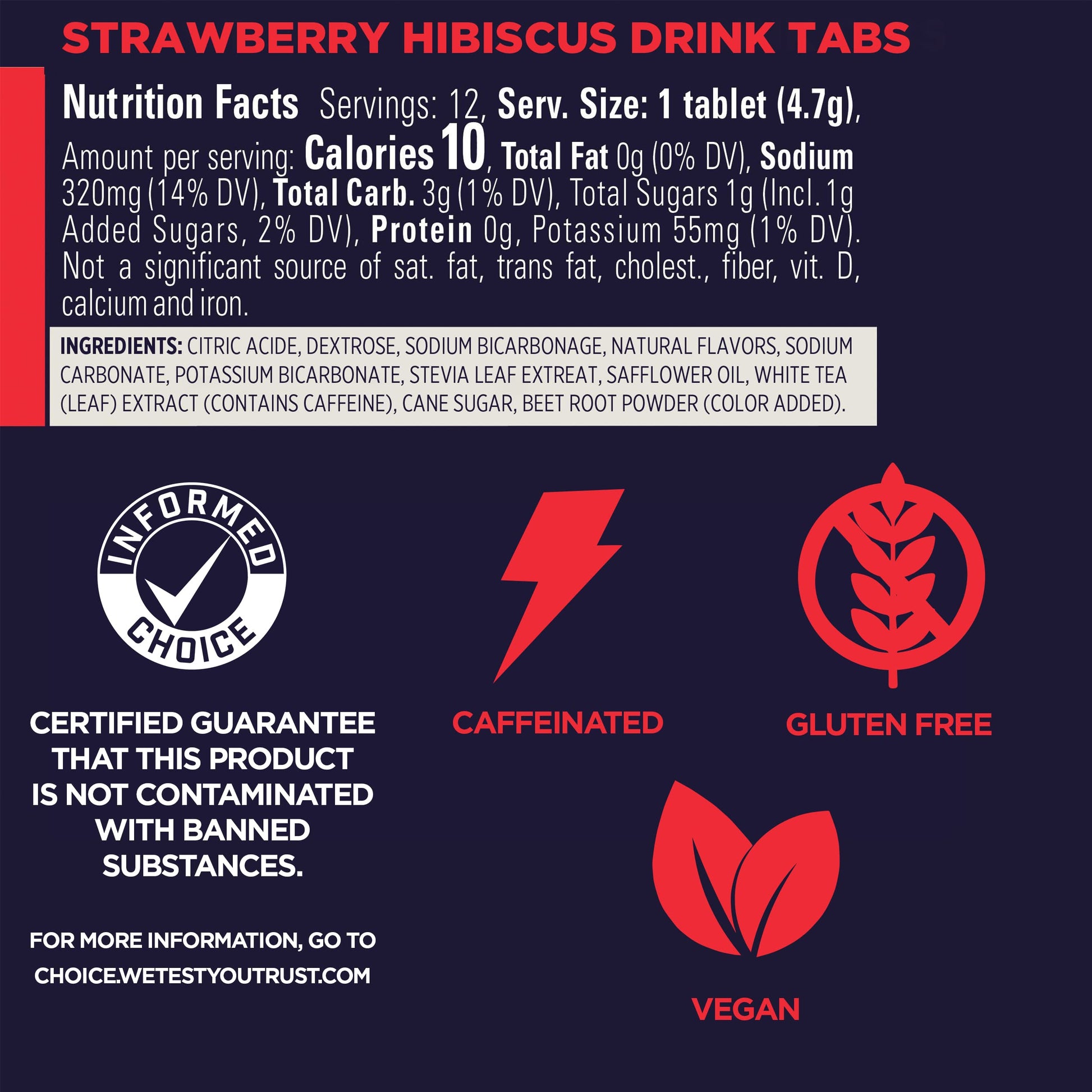 - Strawberry Hibiscus Hydration Drink Tablets contains 20 mg of caffeine per serving.