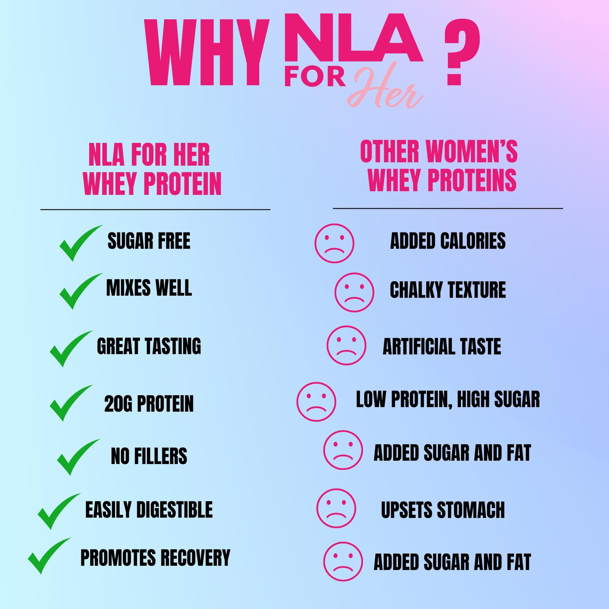 - 💪🏼 SPECIFICALLY FORMULATED FOR WOMEN - NLA For Her Whey protein is scientifically formulated to promote lean muscle growth, support muscular recovery and fuel your muscles for high intensity training. Supplementing with NLA For Her Whey on a daily basis supplies your body with macronutrients that promote lean body composition, curbed appetite, optimum performance and well-being.
