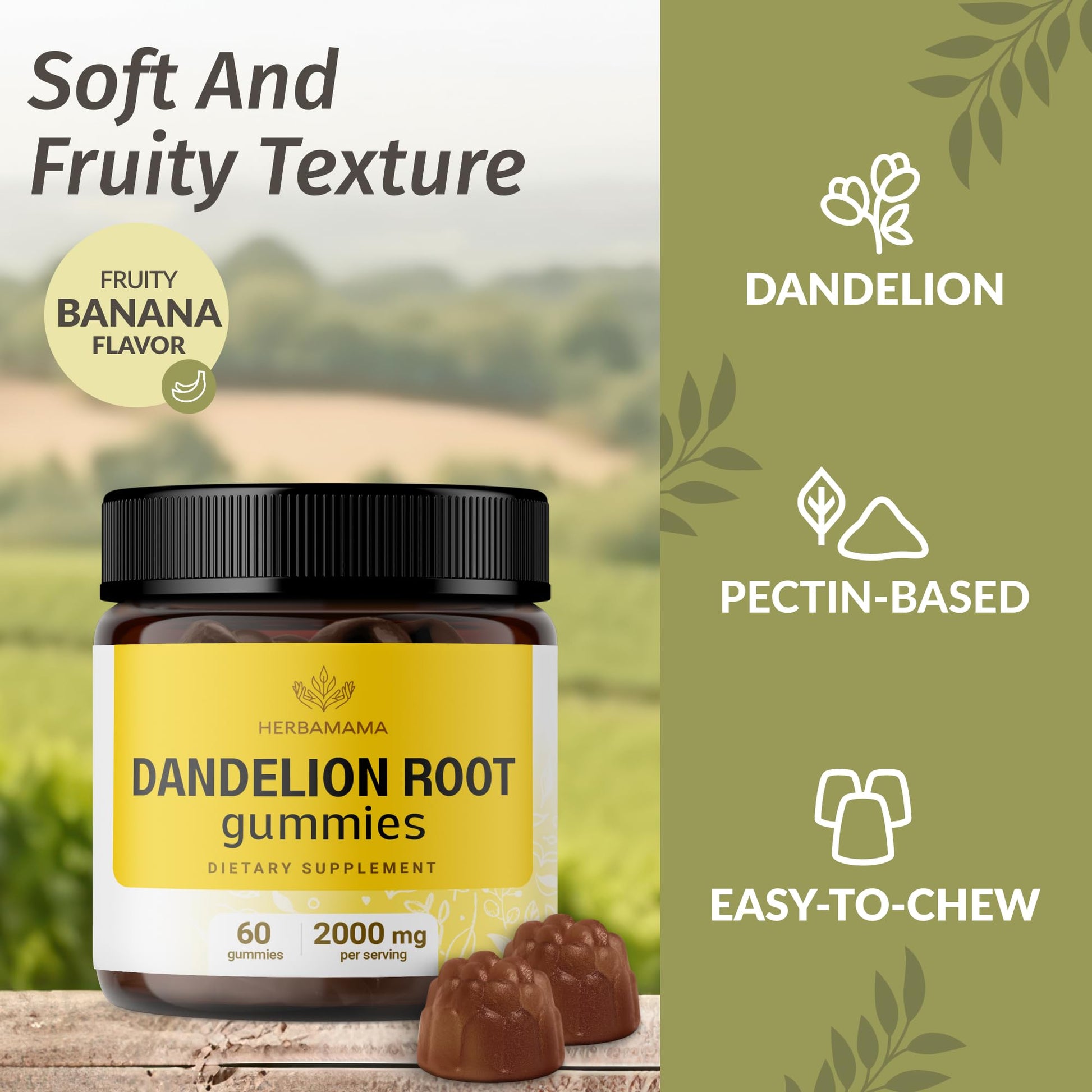 HERBAMAMA Dandelion Root Gummies - 2000mg Dandelion Herb for Liver and Kidney Cleanse Support - Vegan, Non-GMO Liver Support Supplement - 60 Pectin-Based Banana-Flavored Chews