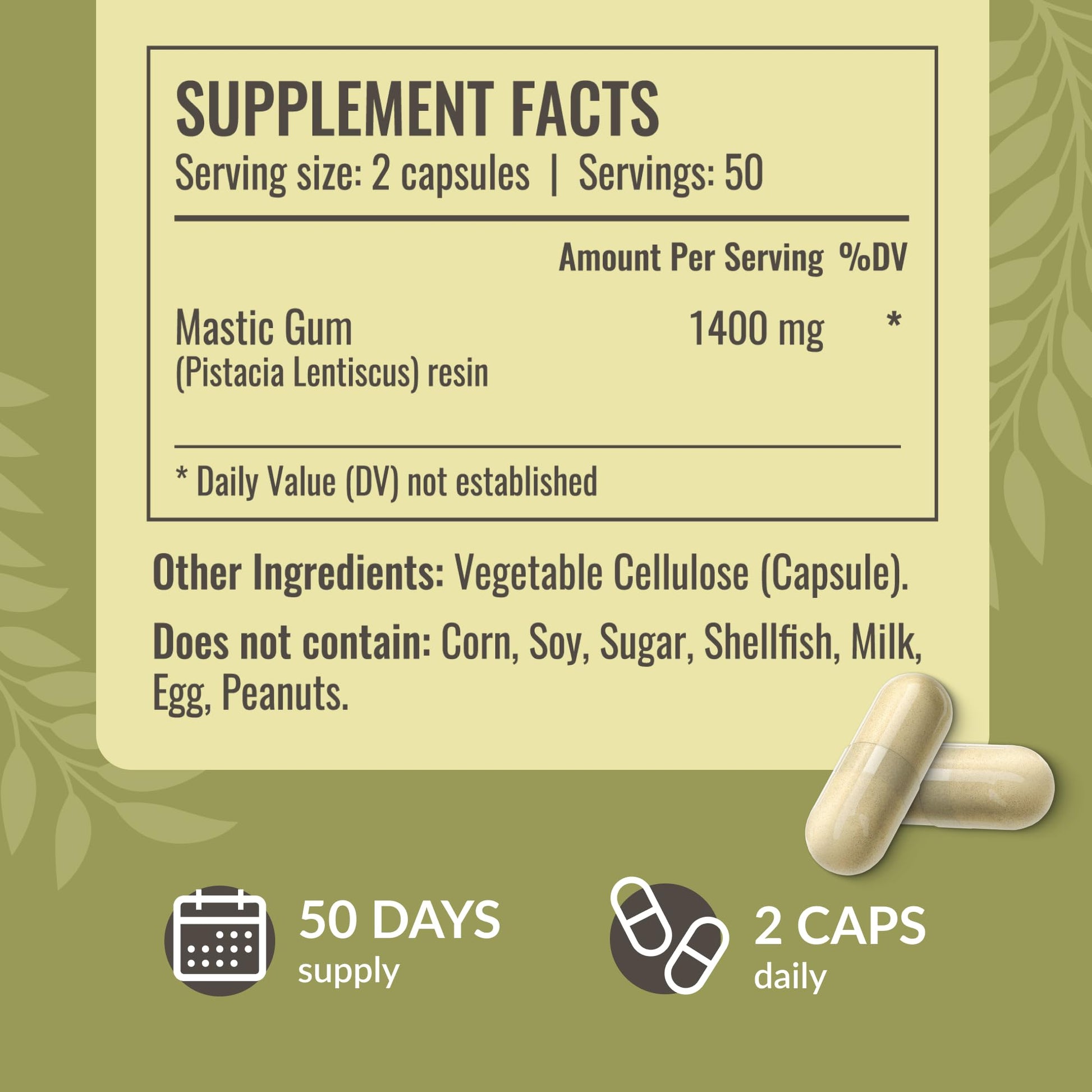 - For a Variety of Lifestyles: Our Mastic gum supplement is gluten-free, non-GMO, free from artificial colors, and any other fillers. Herbamama Mastic Gum powder capsules are crafted to complement any lifestyle.