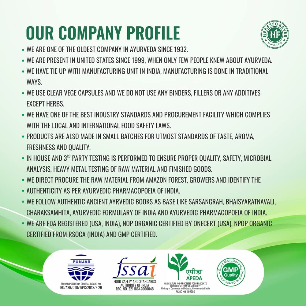 - HERBSFOREVER is committed to using herbs that are sustainably obtained and fairly traded to provide the finest quality of Ayurvedic products. All of our products are IN HOUSE and THIRD PARTY tested to ensure product quality, purity and safety. Our herbs are manufactured according to GMP Standards to ensure the highest quality for manufacturing, packaging, labeling, and Storage operations.