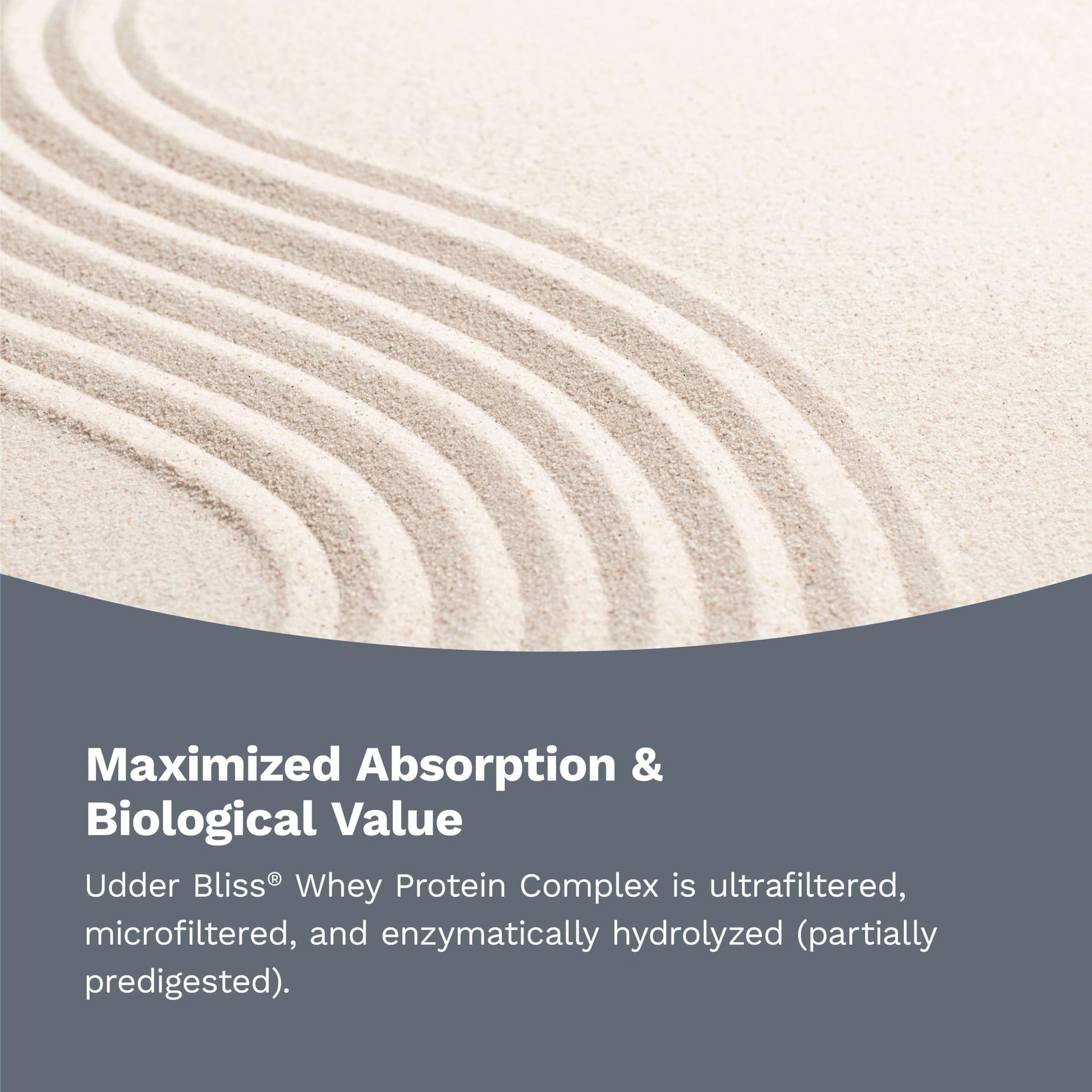 - Why is Udder Bliss Whey Protein Complex good for you? Udder Bliss Whey Protein Complex is made with cold-ultrafiltration technology, which produces with the highest possible bio-functionality which enhances absorption in the body. Protein is the building block of the human body. It supports lean muscle mass and a healthy immune system.