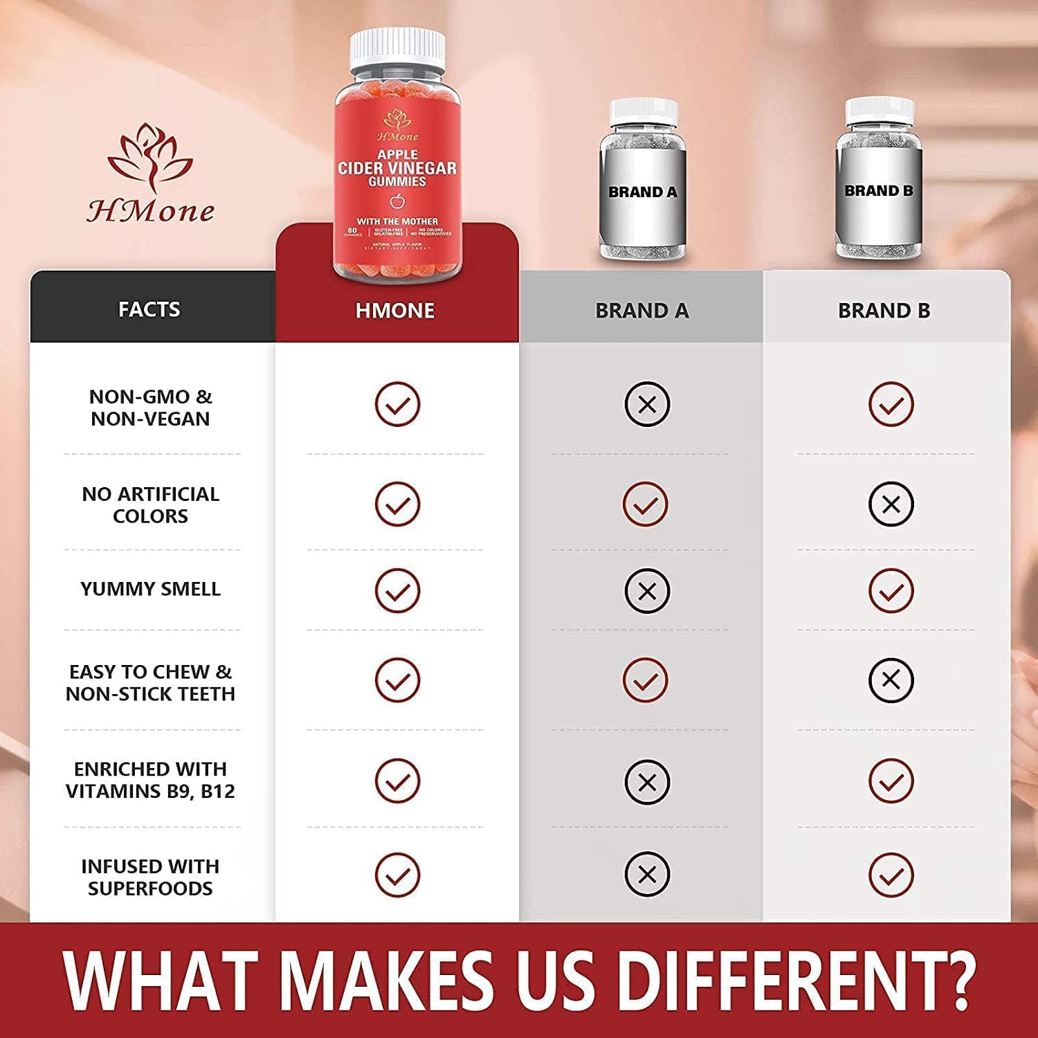 - Extract Natural Materials: HMone apple cider vinegar gummies uses fresh apple juice as a raw material to ferment, retain the mother, and is accompanied by beetroot and pomegranate active ingredients. Every bite you can taste is apple, not vinegar, but to achieve the benefits of ingesting apple cider vinegar. Rich in vitamins B9 and B12, the powerful function of B vitamins can promote healthy skin, make the skin more shiny and smooth.