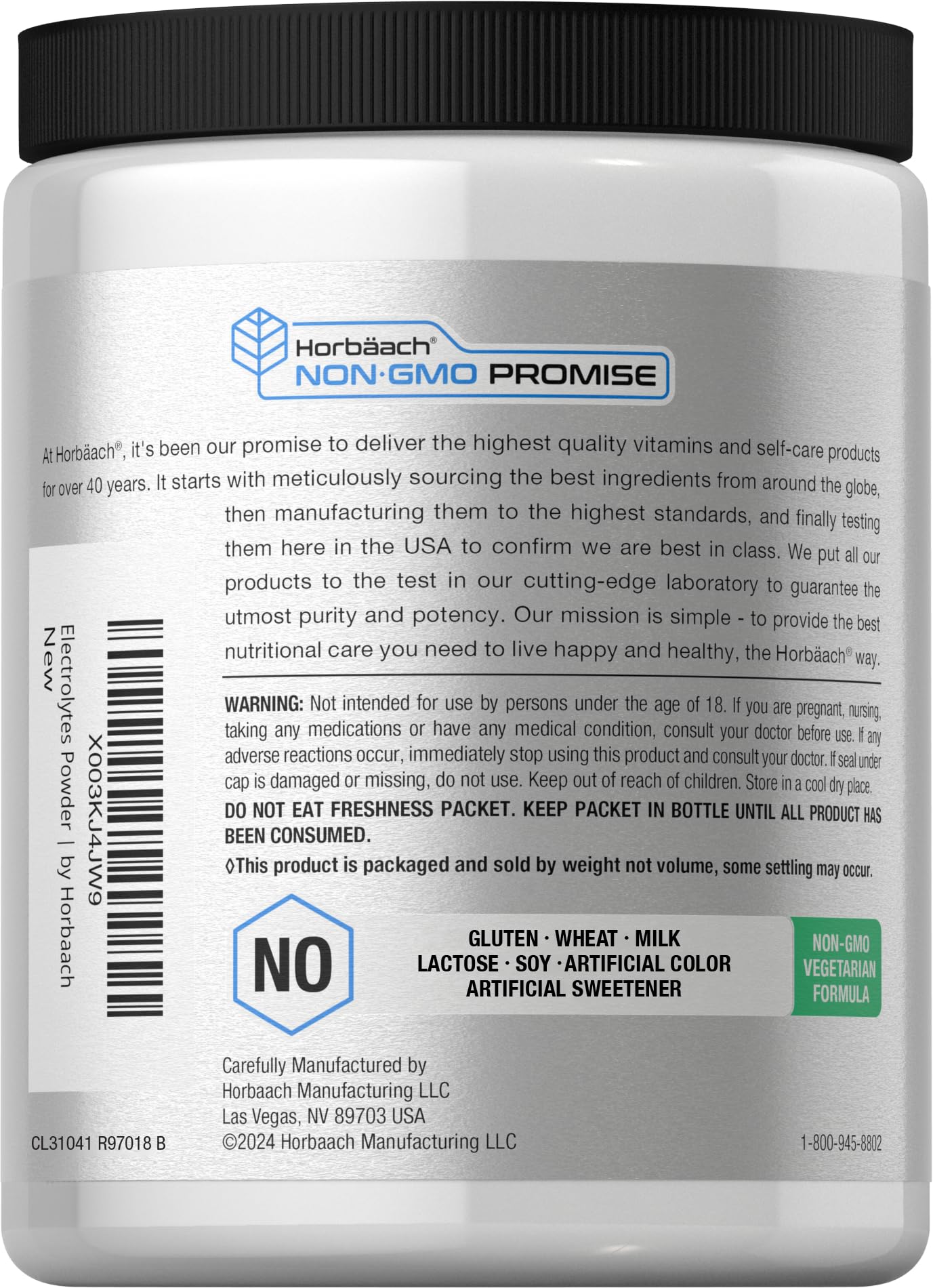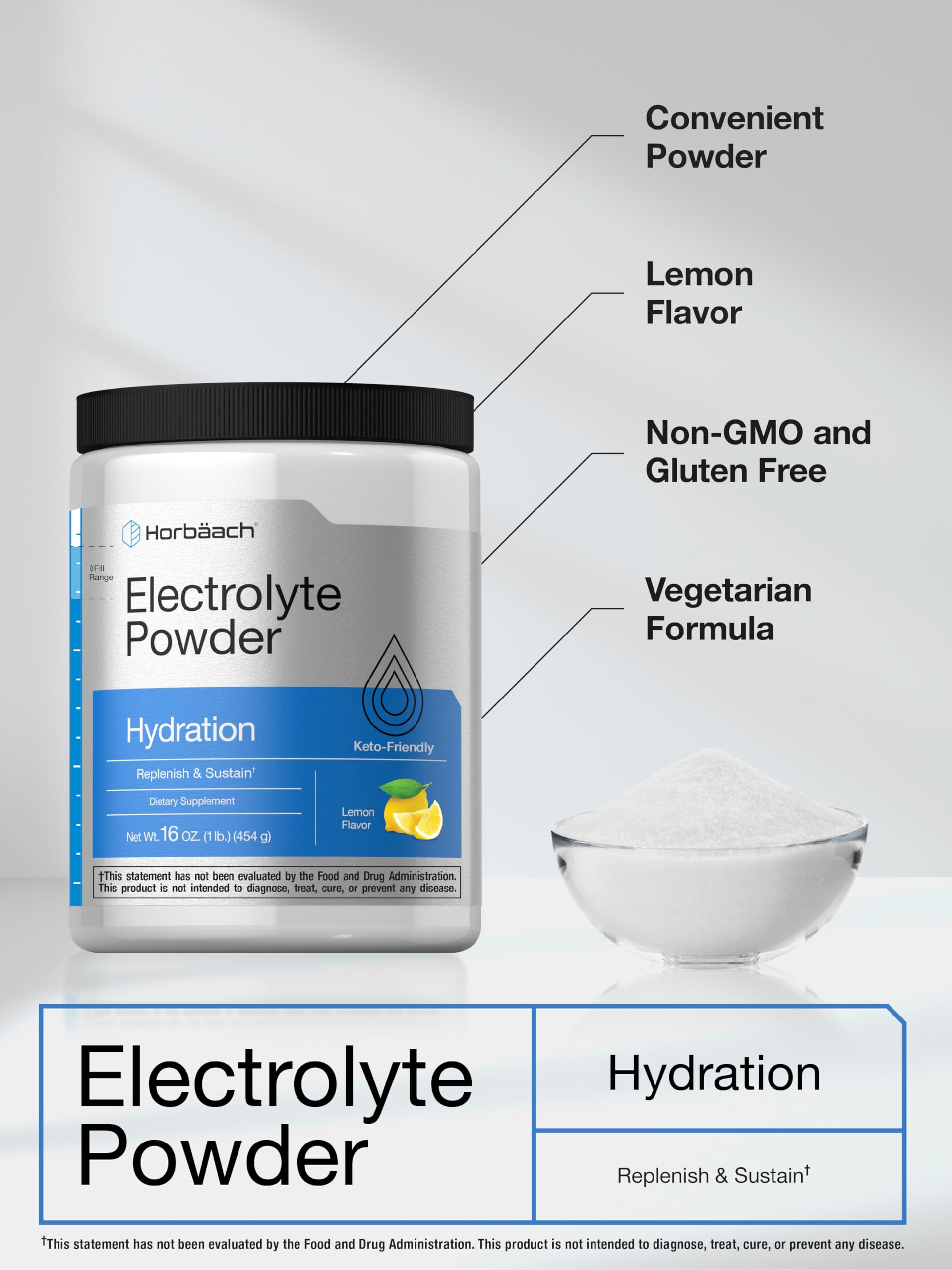 Horbäach Electrolytes Powder | 16 oz | 130 Servings | Hydration Supplement | Vegetarian | Keto-Friendly | Non-GMO, Gluten Free Formula | Lemon Flavor