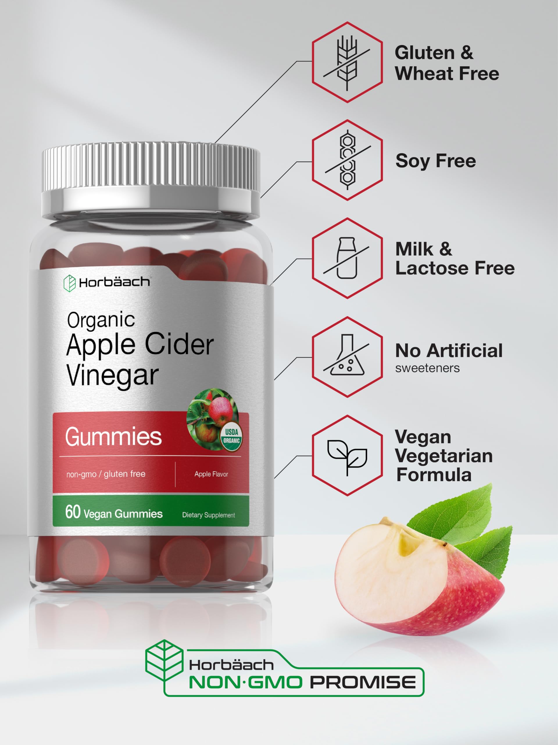 Horbäach Organic Apple Cider Vinegar Gummies | 60 Gummies | Vegan, Non-GMO & Gluten-Free Supplement | USDA Organic ACV | Apple Flavor