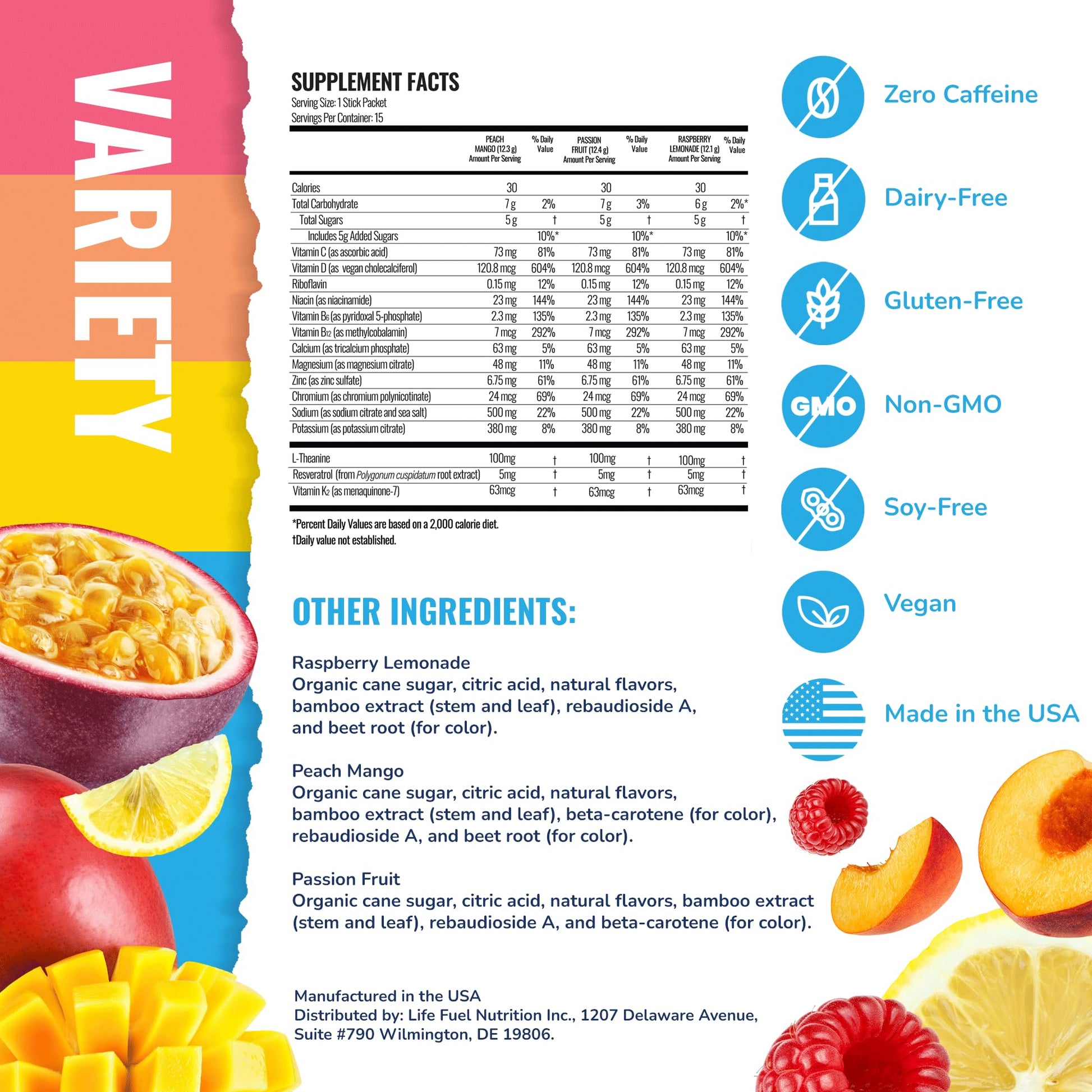 Hyburst Energy + Hydration Amplifier - Multivitamin Electrolyte Powder Packets with Vitamins D3 K2 & B6 B12 | L-Theanine, Cane Sugar, Caffeine Free Energy Drink Powder | Variety Pack, 15 Pack