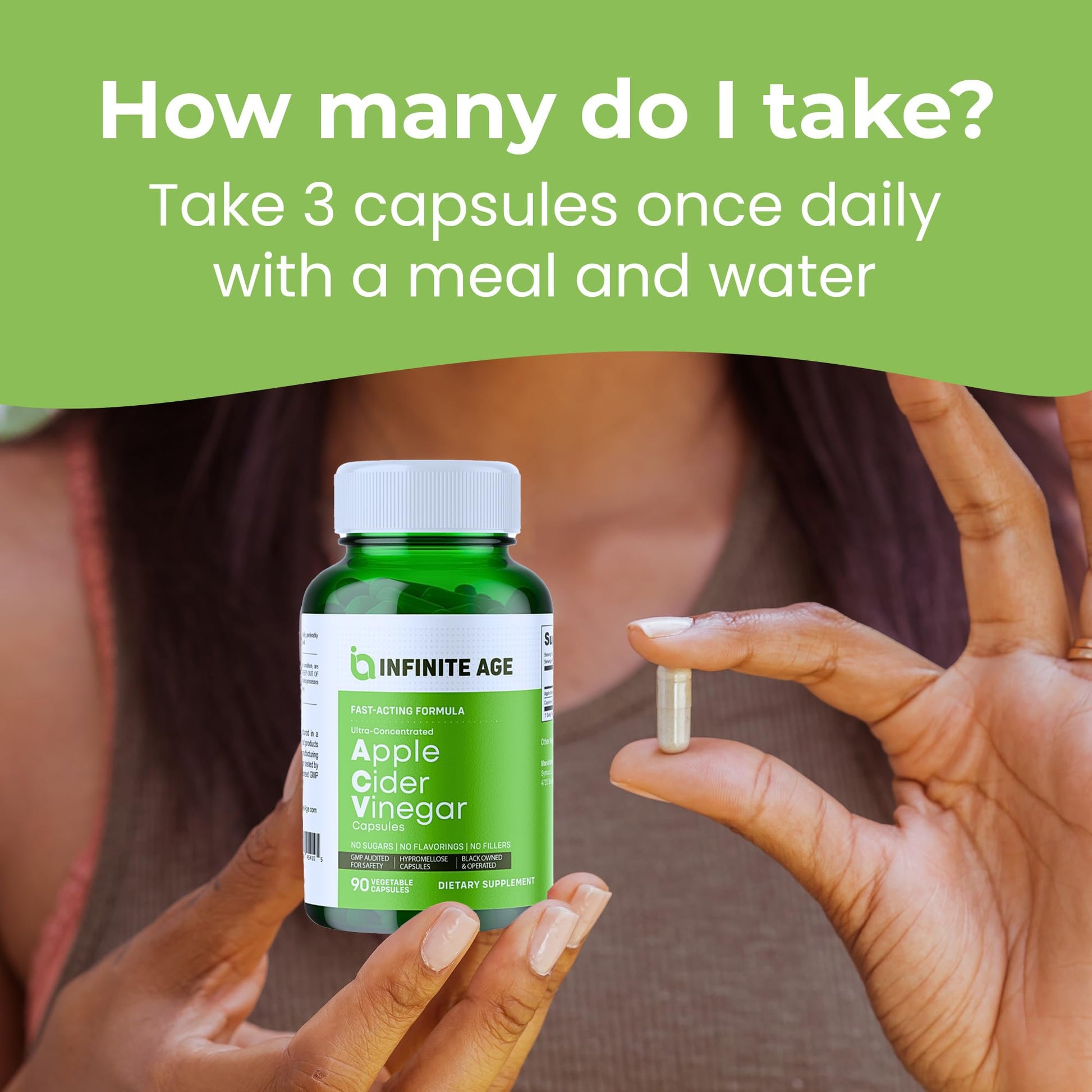 - APPLE CIDER VINEGAR CAPSULES: Embrace a holistic approach to your daily health regimen with Infinite Age Apple Cider Vinegar Capsules. Our premium ACV formula is designed to support overall wellness, providing a natural boost to your body's systems. These capsules are your ally in maintaining a balanced lifestyle.