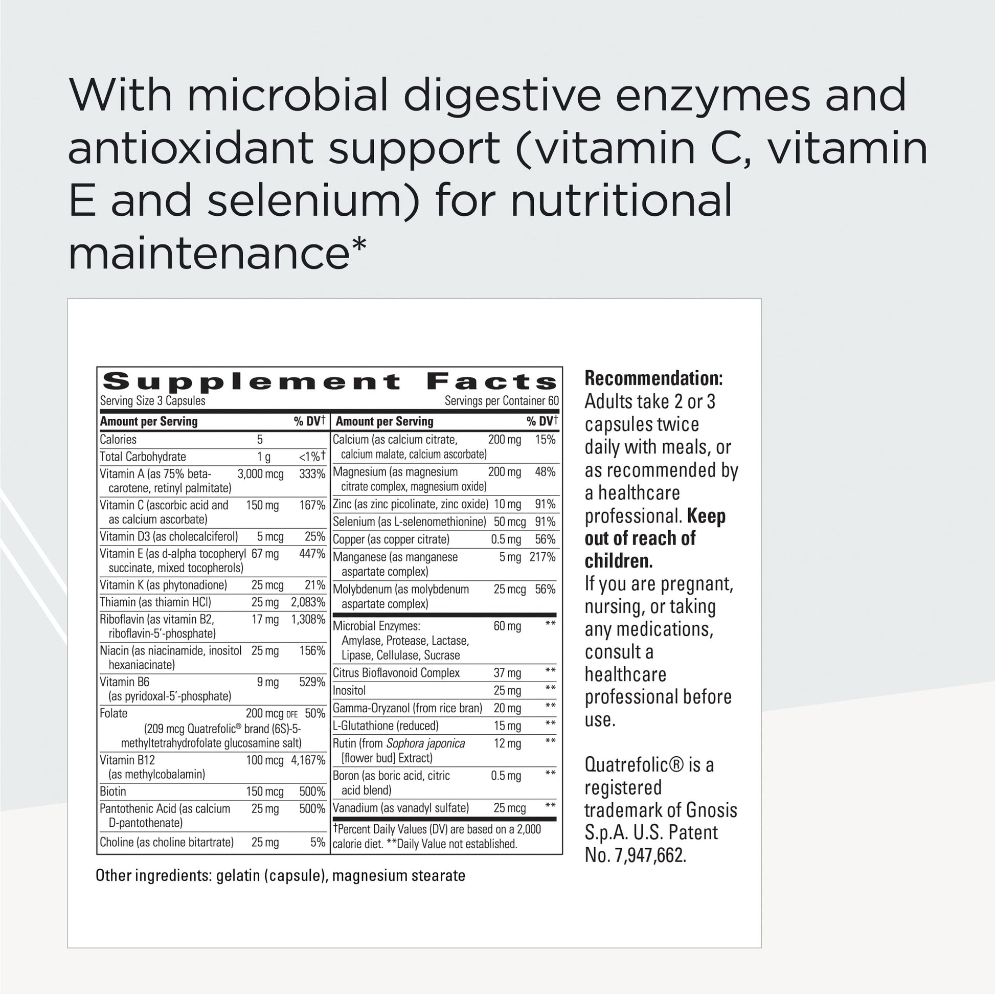 - Multivitamin Mineral Supplement: This supplement contains microbial digestive enzymes and antioxidant support (vitamin C, vitamin E ,and selenium) for nutritional maintenance*