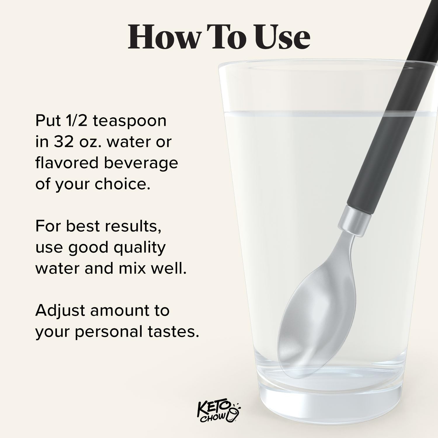 - Keto Chow Electrolyte Drops Are Perfect For Your Busy Lifestyle! Our electrolyte drops come in 4 convenient sizes. Take them on the go with our Pocket Flask (can treat 2.5 gallons), Medium Refill Size (can treat up to 12.5 gallons), Large Refill Size (can treat up to 25 gallons), or The BIG Refill (can treat up to 56 Gallons).