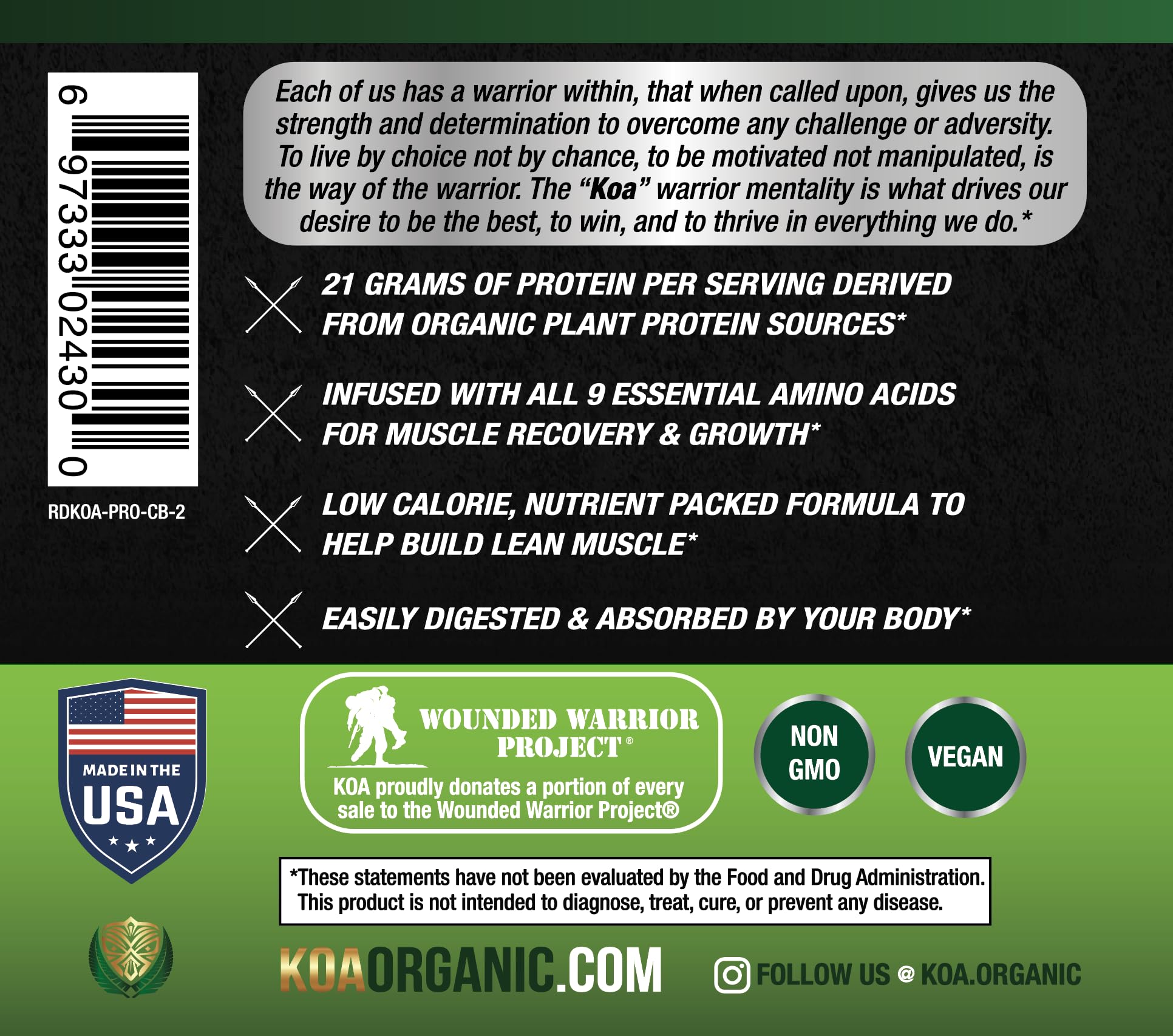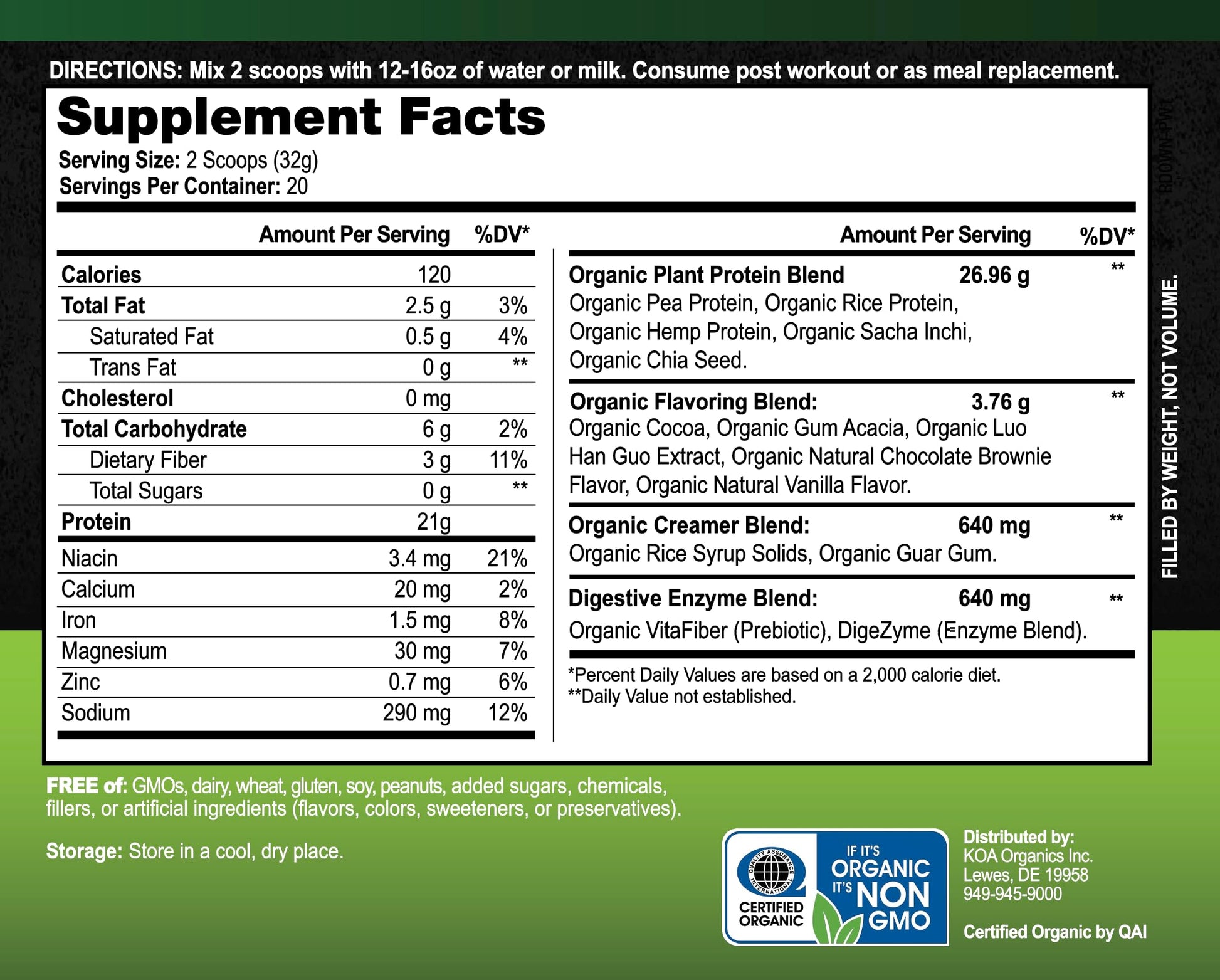 KOA Organics Vegan Protein Powder, Gourmet Chocolate Brownie Flavor- 21g of The Best Tasting Plant-Based Protein with only 120 Calories - USDA Organic, Non-GMO, Gluten Free, Sugar Free - 640g