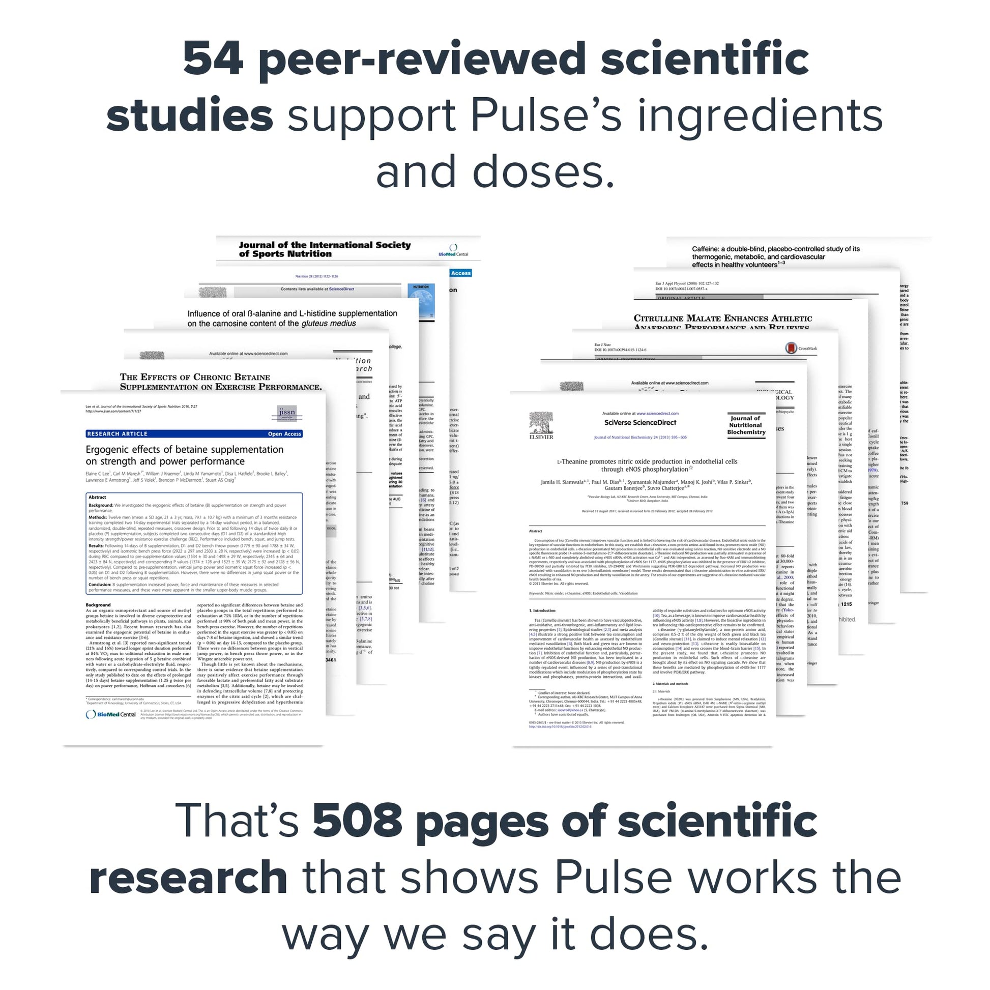 - 54 peer-reviewed scientific studies support the effectiveness of Pulse preworkout’s precise combination of ingredients and doses. That’s 508 pages of scientific research that shows Pulse prework out works the way we say it does.