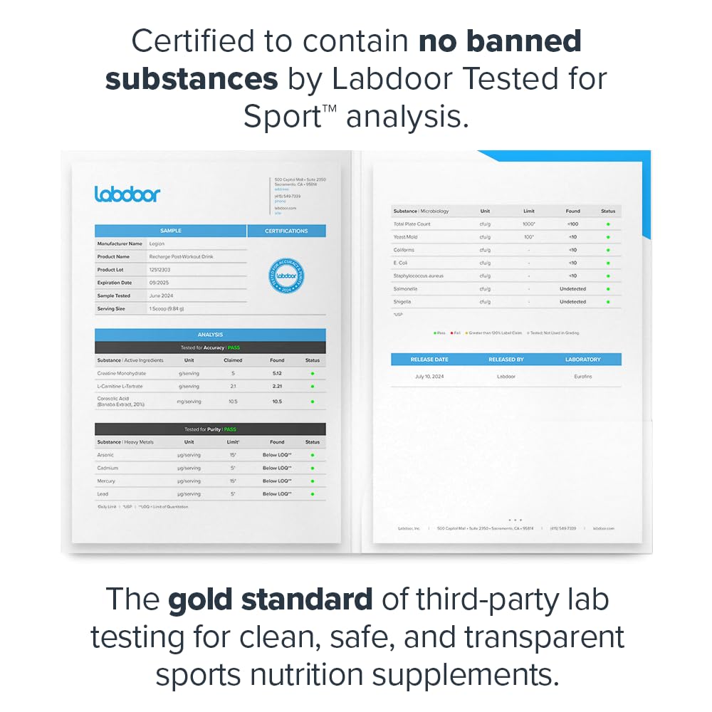 - Tested for purity and potency in an ISO 17025 accredited third-party lab, and independently certified to contain no contaminants or banned substances by Labdoor. Every bottle of our Recharge workout supplement for men and women is guaranteed to provide exactly what the label claims and nothing else.