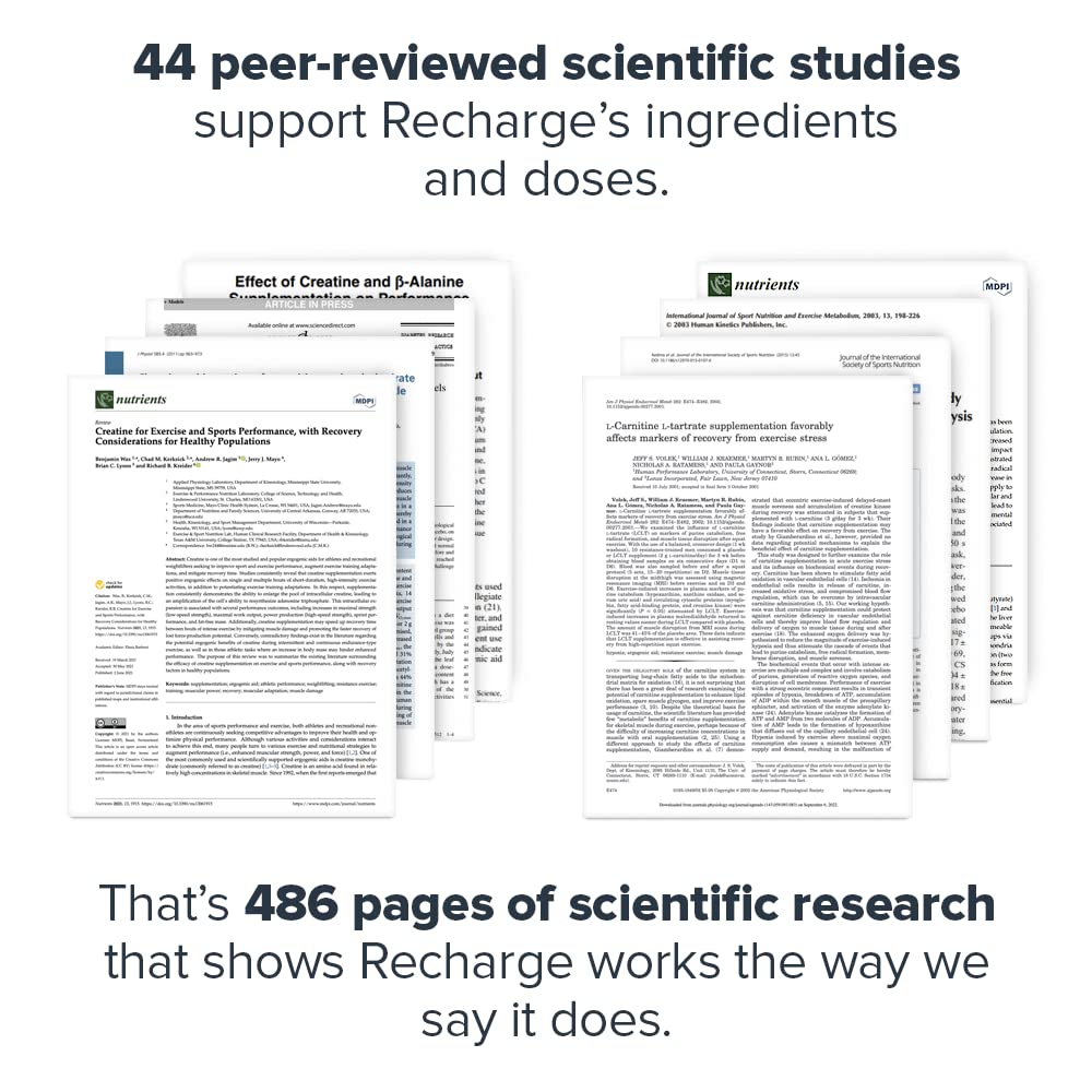 - 44 peer-reviewed scientific studies support Recharge’s combination of ingredients and doses, including flavored creatine. That’s 486 pages of scientific research that shows Recharge muscle builder for men and women works exactly like we say it does.