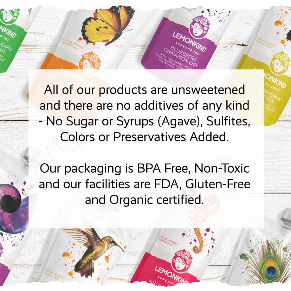- MOUTHWATERING FUNCTIONAL FLAVORS: Includes our Chlorella Infused Greens for Detox & Hydration, our Aronia Berry Lemonade for Immune Support, our Alphonso Mango Peppermint Green Tea for Energy, our Turmeric Carrot Gingerade for Antioxidants and, our Blueberry Cinnamon Chia for Digestion & Sport Health.