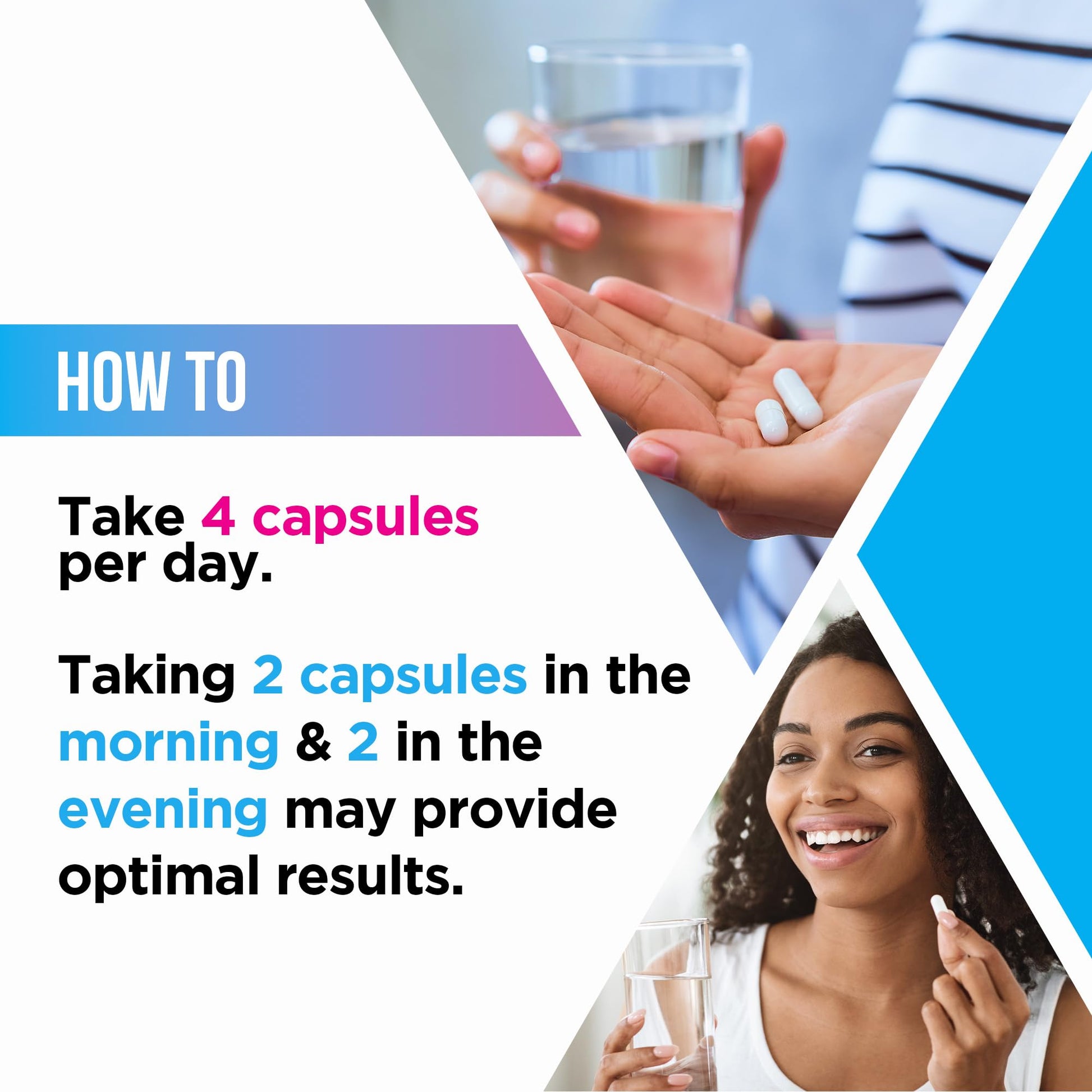 - When to Take: The 4-capsule dosage may provide more optimal results if split in half, taking 2 capsules in the morning and 2 in the evening.