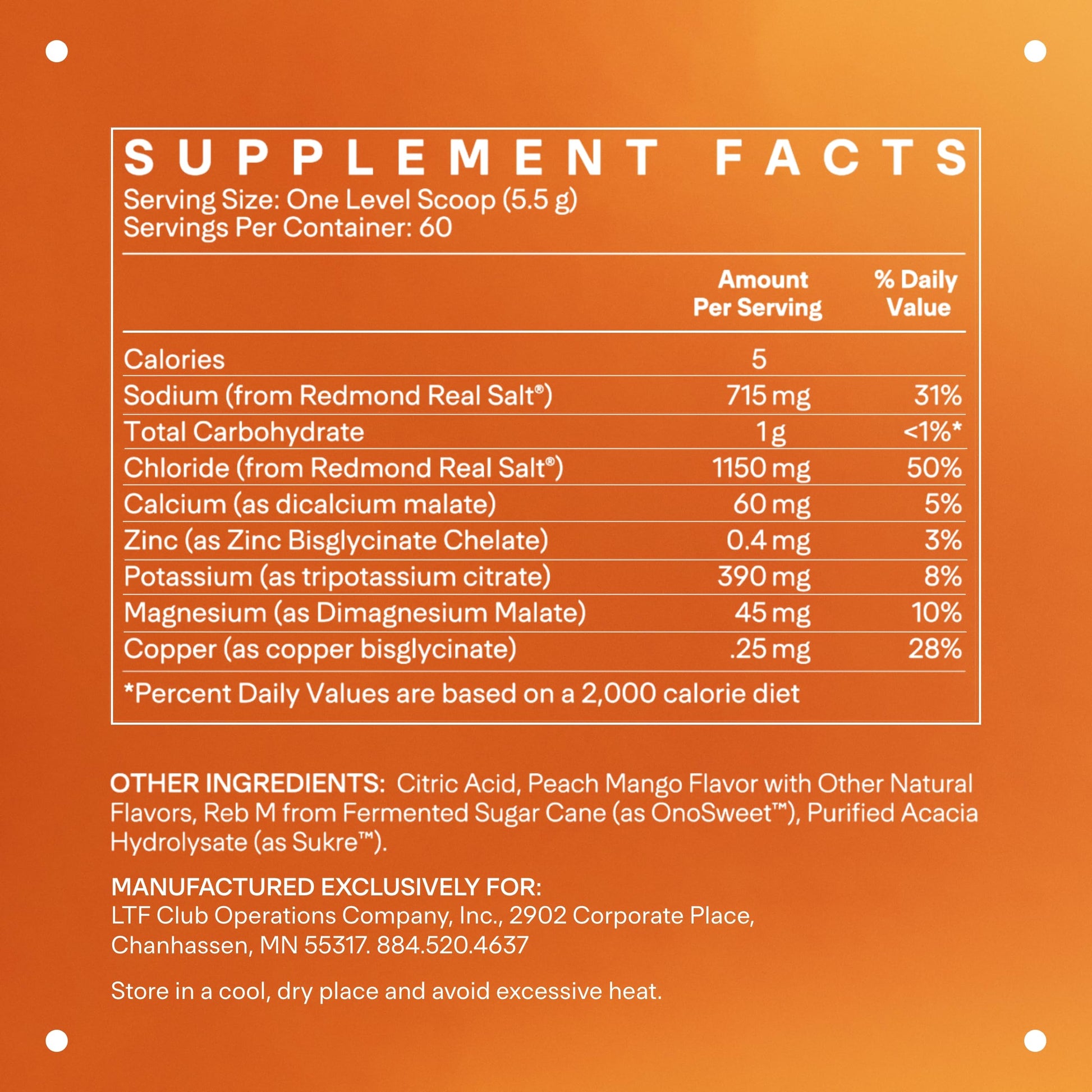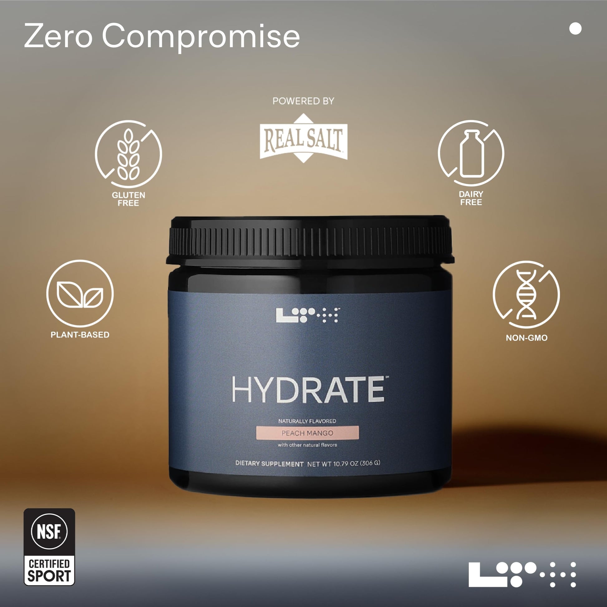 LTH Hydrate Hydration Mix - NSF Certified for Sport - Premium Electrolyte Powder - with Redmond Real Salt - Plant-Based, Non-GMO, Gluten Free & Dairy Free - 60 Servings (Peach Mango)