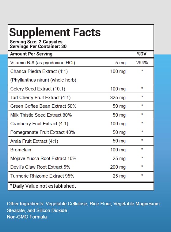 - Regulates Uric Acid Levels: Citric acid and celery seed extract help regulate uric acid levels and promote its excretion. Chanca Piedra and tart cherry support healthy uric acid metabolism and provide antioxidant benefits.