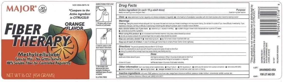 Major Fiber Therapy Easy to Mix Non-Gritty Texture Orange Flavor Methylcellulose 100% Soluble Fiber for Controlled Regularity - 16 Oz