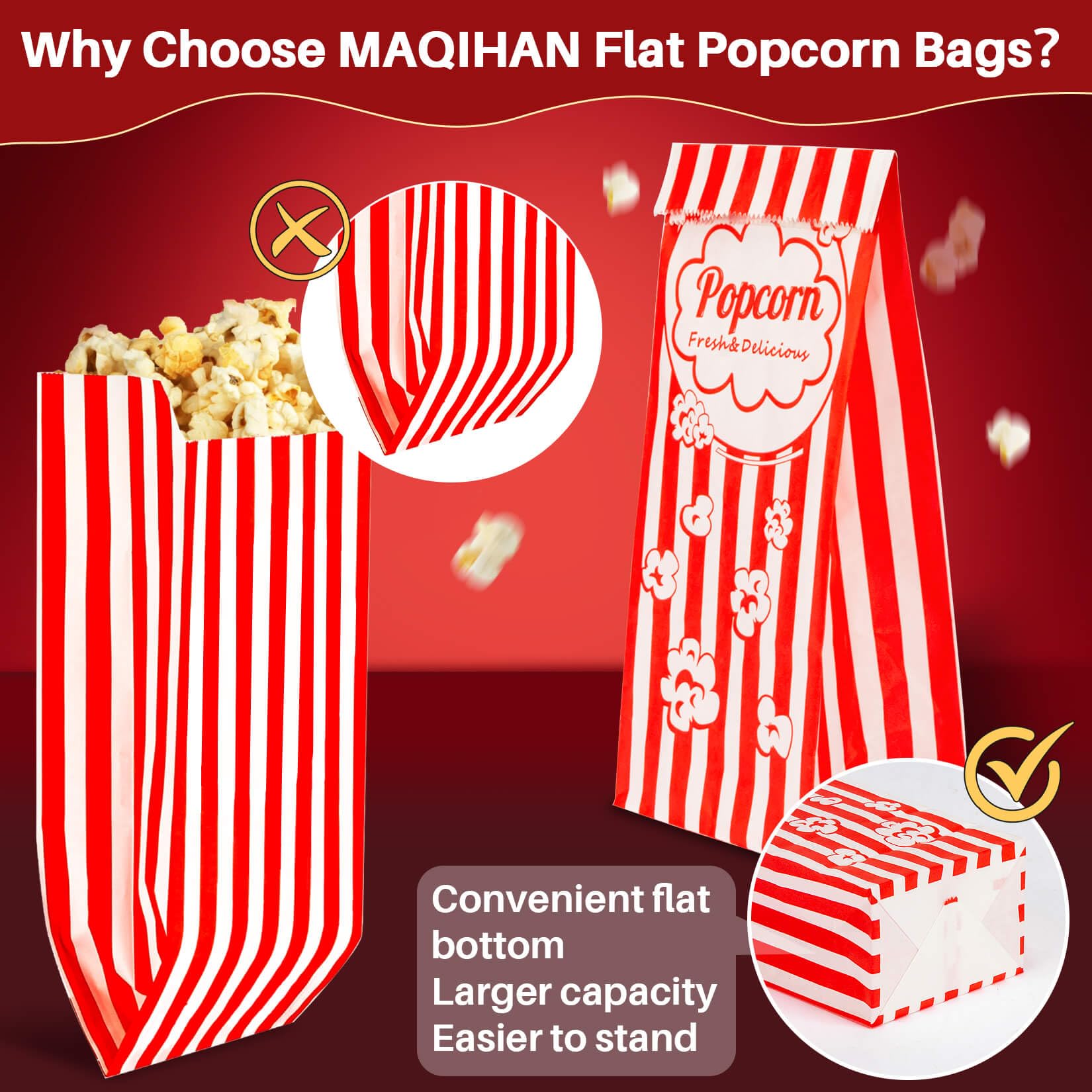 - ?Convenient Flat Bottom?Say goodbye to the hassle of folding and struggling with traditional pointed popcorn bags! Our Flat Bottom Popcorn Bags offer the ???????????????? ?????????????????????? with their unique design that ???????????? ???? ???? ?????? ?????? , making them the perfect choice for movie nights, parties, and more • Don't settle for less - upgrade to our flat bottom bags and enjoy your popcorn with ease!