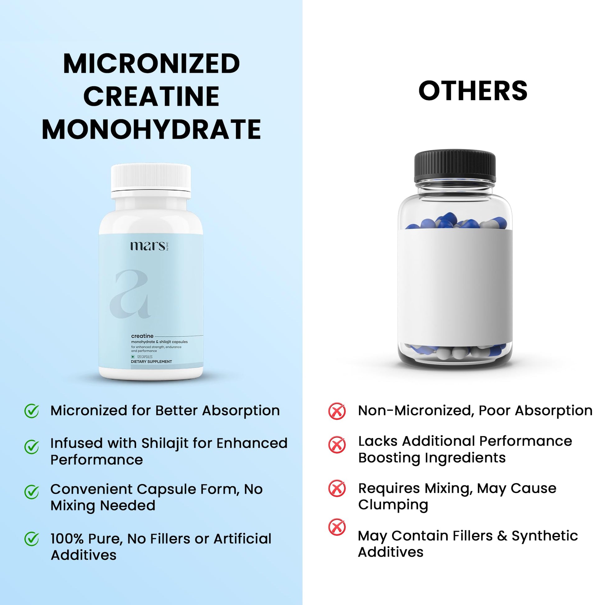 - Clean, Safe, and Potent Formula: Mars Micronized Creatine Monohydrate Caps are lab-tested, FDA-compliant, and crafted without artificial fillers or additives. Each capsule provides a potent, clean formula, ideal for those seeking natural supplements to support performance and endurance without unwanted side effects. Our product comes with a certificate of authenticity, assuring you of the highest quality and purity in every batch.