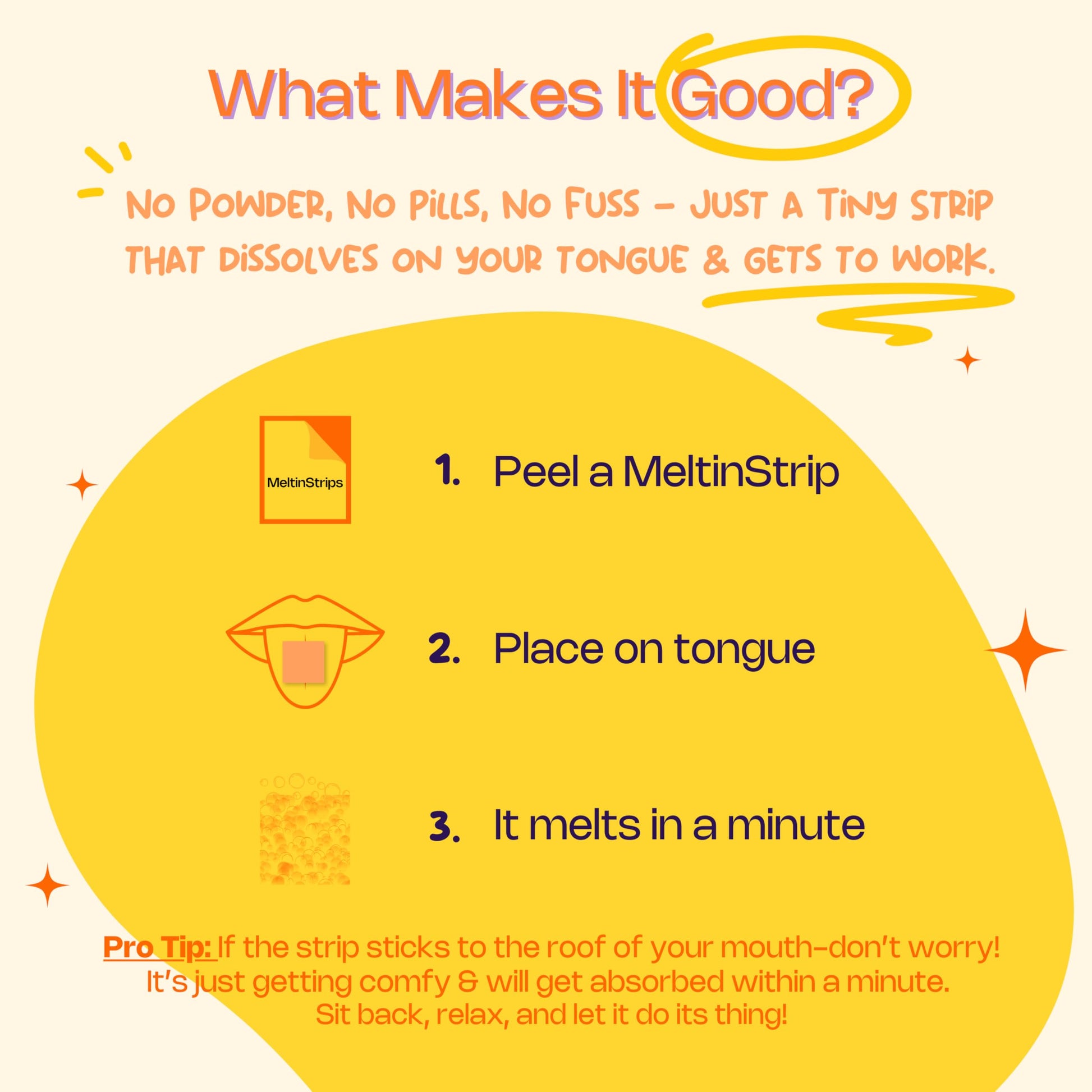 - ASHWAGANDHA INFUSED ENERGY: Experience a rapid energy boost with MELTINSTRIPS energy oral strips! Packed with natural caffeine, Ashwagandha, and Vitamin B12, these strips deliver fast-acting, sustained energy without the jitters. Our energy strips are delicious, providing the perfect pick-me-up anytime, anywhere.