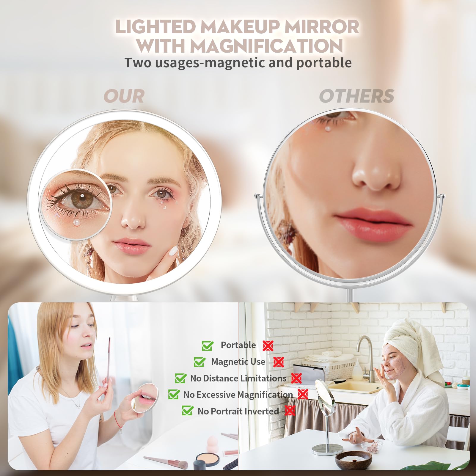 - 10-Inch Professional Dual Magnification:10-inch diameter with angle adjustment conquers height/angular limits in bedrooms/bathrooms,ensure full-view clarity.The 14.17" comfort height (36cm) + micro-angle selection ensure without neck strain.7X magnetic zoom detaches for hands-free/mobile precision - zero distortion on brows/lashes. Style freely: no leans, no barriers.