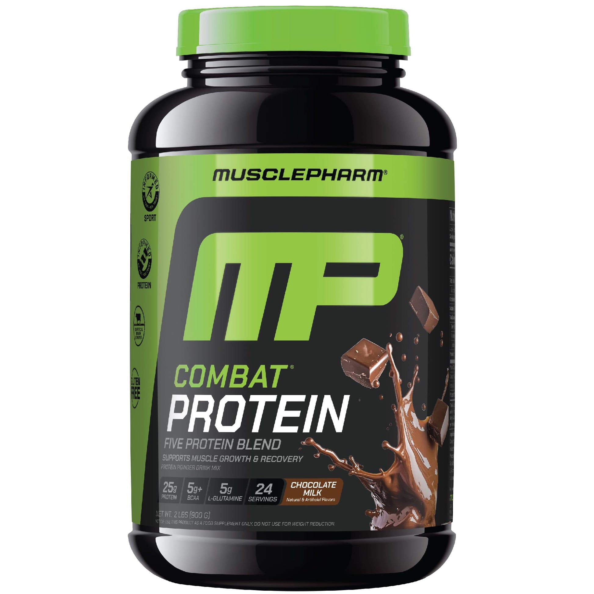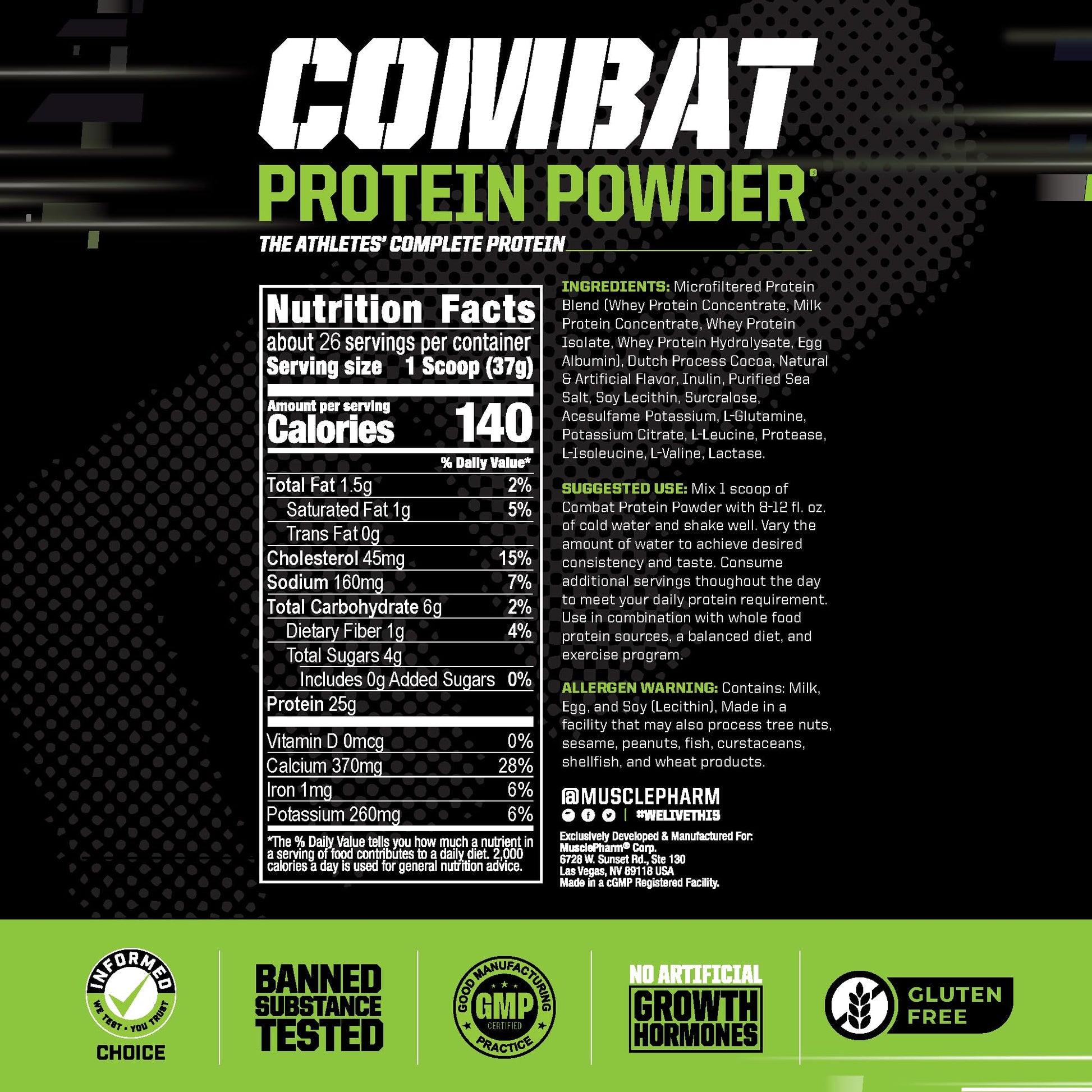 - Crafted by Experts, Delivered with Excellence: MusclePharm Combat Protein Powder is gluten free, banned substance tested and certified by Informed-Choice and Informed-Protein, so athletes can take it with confidence.
