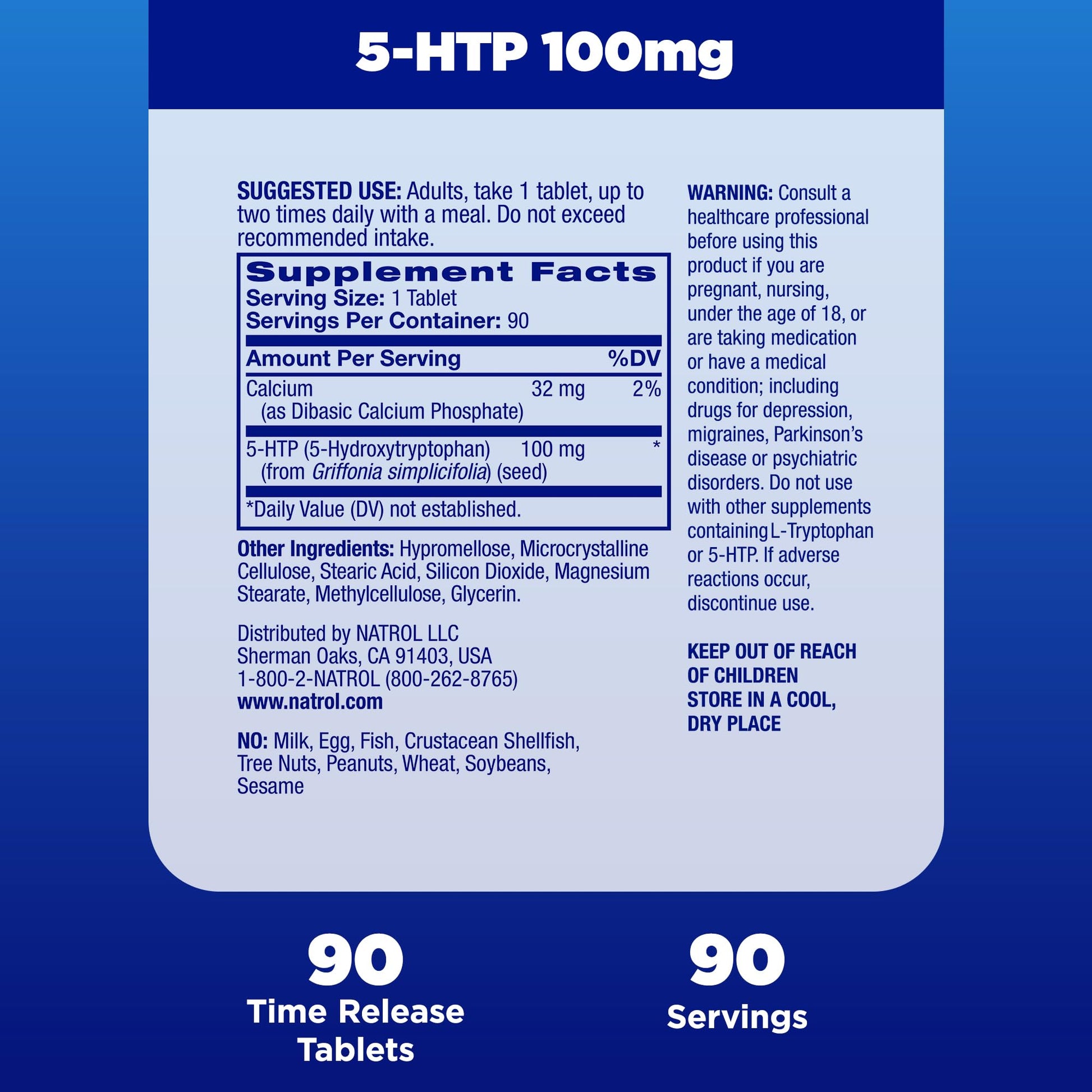 - One (1) 90 count bottle of Natrol 5-HTP 100 mg time release tablets mood support supplement for a 45- to 90-day supply