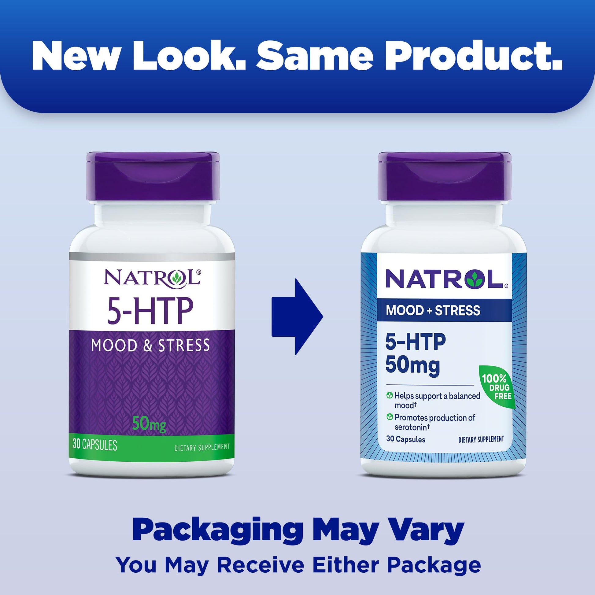 - Mood and Stress Support Supplement*: Contains one 30 count bottle of Natrol 5-HTP 50mg capsules for a 7- to 30-day supply