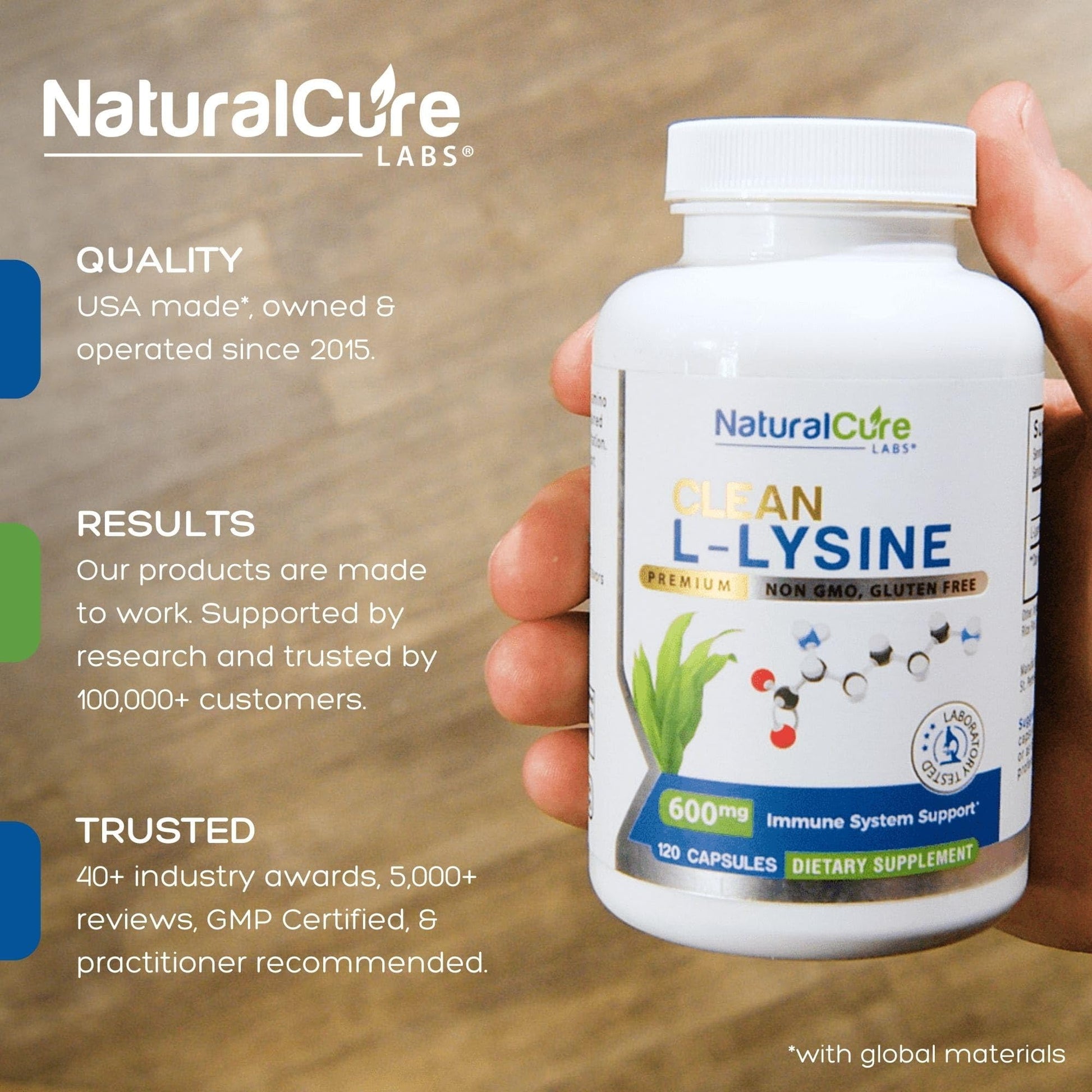 Natural Cure Labs Clean L-Lysine 600mg, 120 Capsules | Vegan, Non-GMO, & Gluten Free