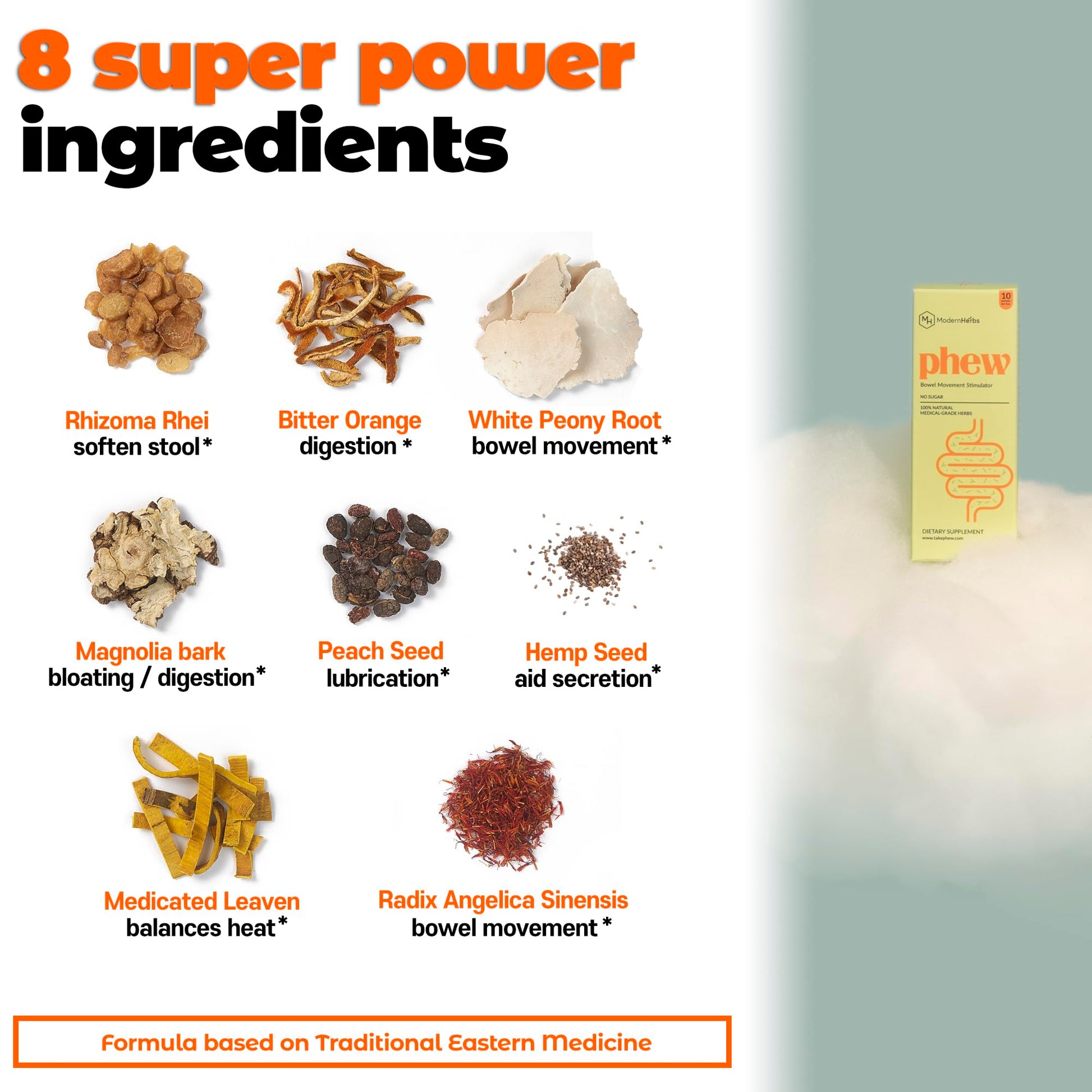 - A STIMULANT-FREE BLOATING RELIEF - Phew’s unique formula is non-addictive and supports gentle regularity while providing bloating relief. Avoid dependency with our soothing, herbal-based solution that promotes digestive health while easing constipation naturally.