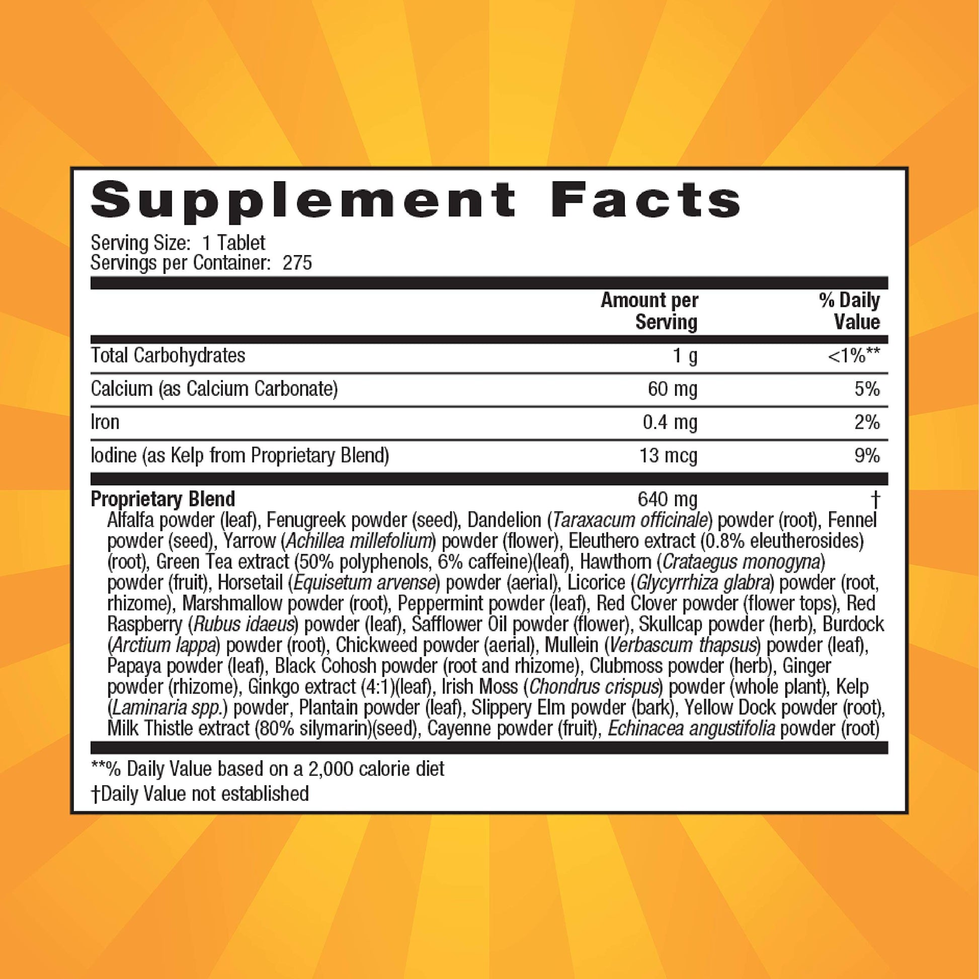 - PROPRIETARY BLEND - Contains 640 mg Alfalfa powder, Fenugreek powder, Dandelion (Taraxacum officinale) powder, Fennel powder, Yarrow (Achillea millefolium) powder, Eleuthero extract (0.8% eleutherosides), Green Tea extract (50% polyphenols, 6% caffeine), Hawthorn (Crataegus monogyna)powder, Horsetail (Equisetum arvense) powder along with Licorice (Glycyrrhiza glabra) powder.