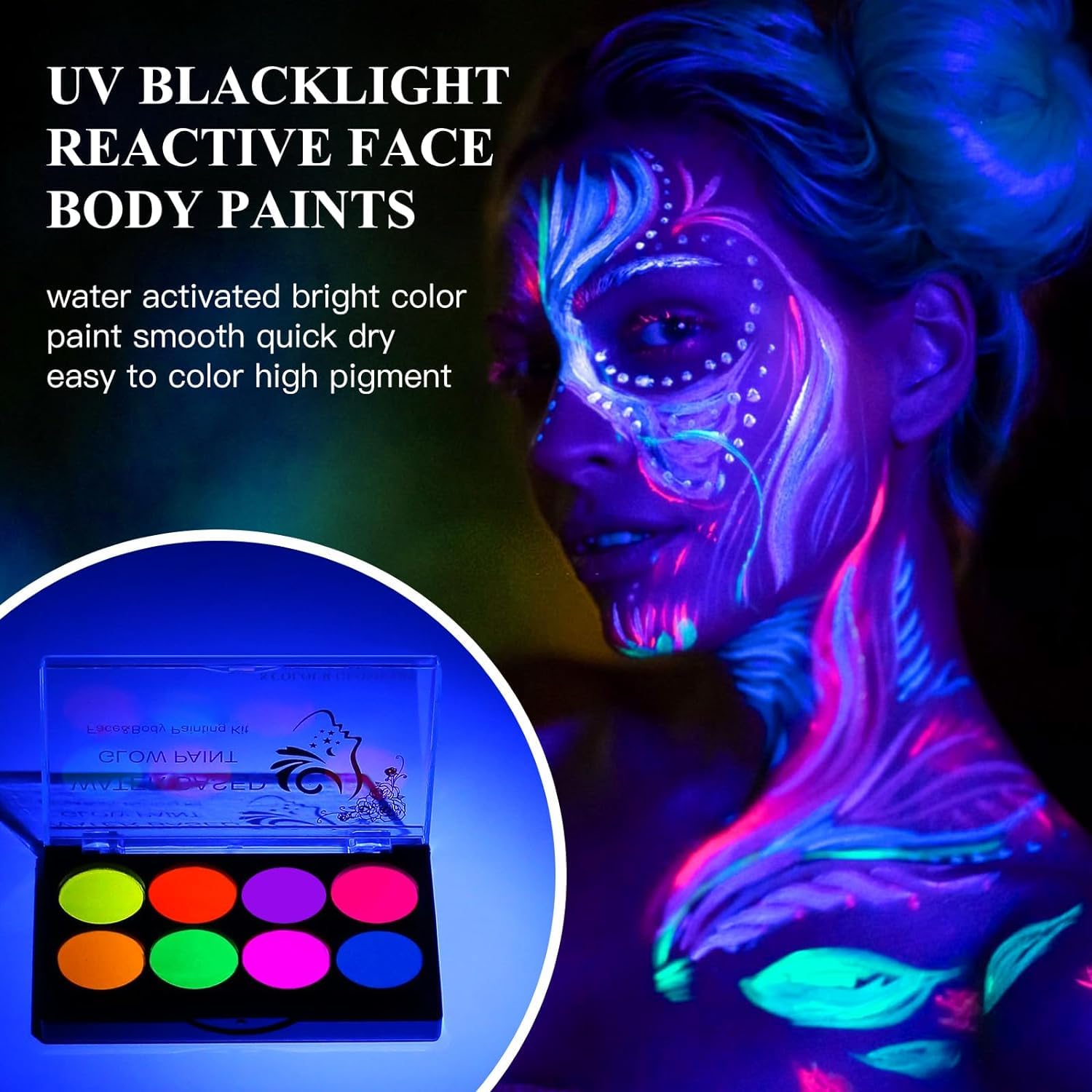 "Neon UV Blacklight Glow Face & Body Paint - 8 Bright Fluorescent Colors, Water-Activated Eyeliner - Glow-in-the-Dark Halloween & Rave Makeup - Washable, Water-Based for Kids & Adults"