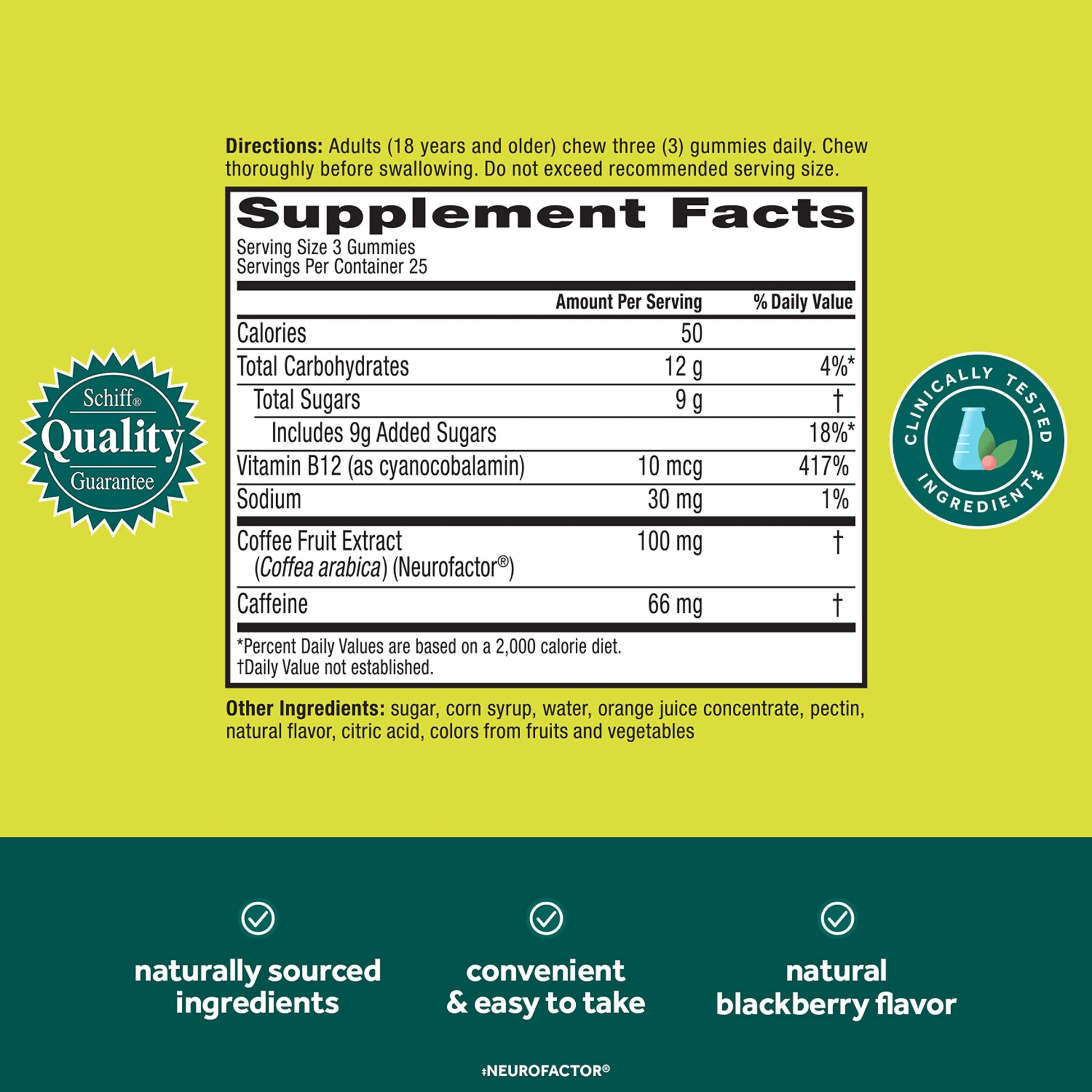 - ENERGY SUPPLEMENT: Need to power up? These delicious blackberry flavored gummies are a total game changer, thanks to 66mg of naturally sourced caffeine per serving they offer an immediate energy boost (no lag).