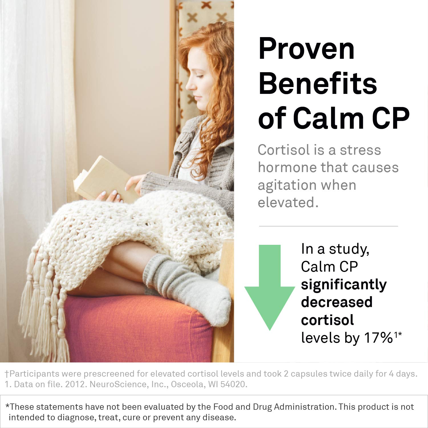 - Shown to Help Lower Cortisol - In a study on the effectiveness of Calm CP, participants were prescreened for elevated cortisol levels. Calm CP was shown to reduce cortisol (mean daily cortisol) by 17%.*