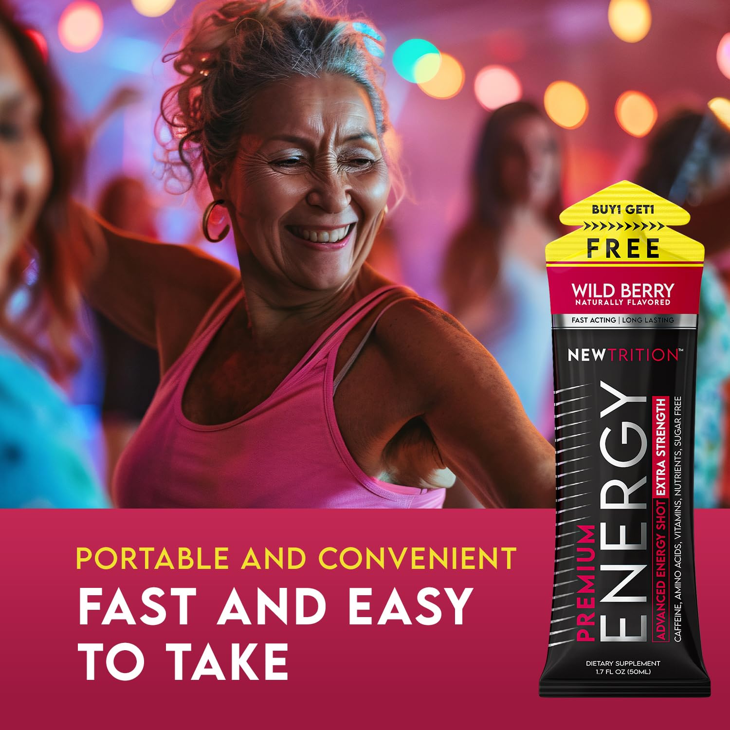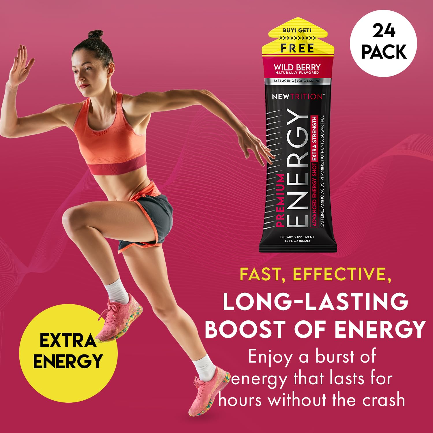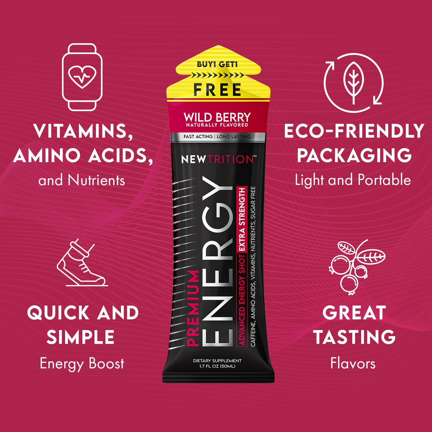 - Energy Supplements: NewTrition's Extra Strength Energy Shots provide a quick, effective, and long-lasting energy boost; Indulge in the refreshing taste of wild berry, that is sure to delight while giving the energy kick you need