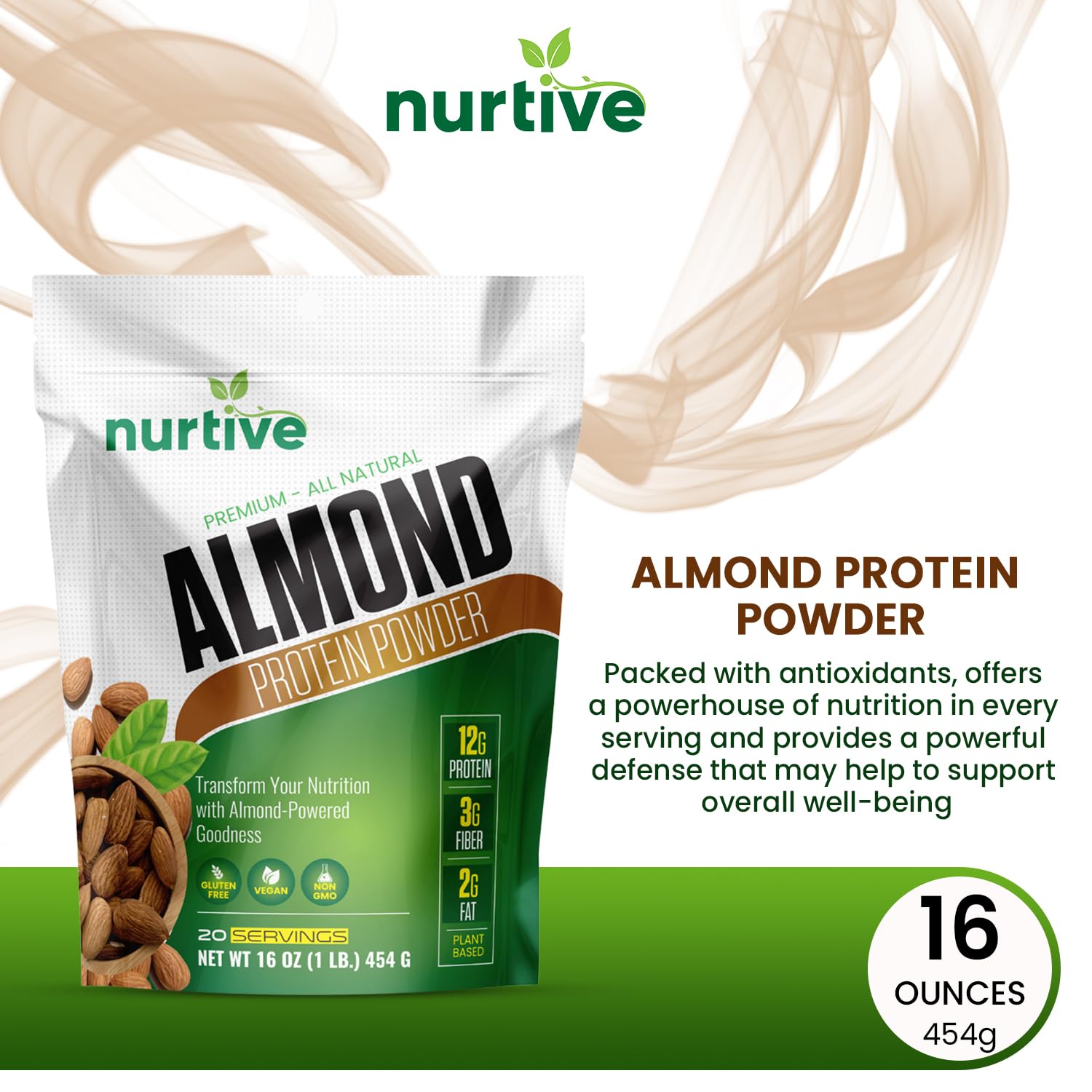 NURTIVE Almond Protein Powder - Rich in Antioxidants & Plant-Based - Nutritional Boost for Smoothies & Baking - Gluten Free, Non-GMO & Free from Artificial Additives - 20 Servings (16 oz / 454 g)
