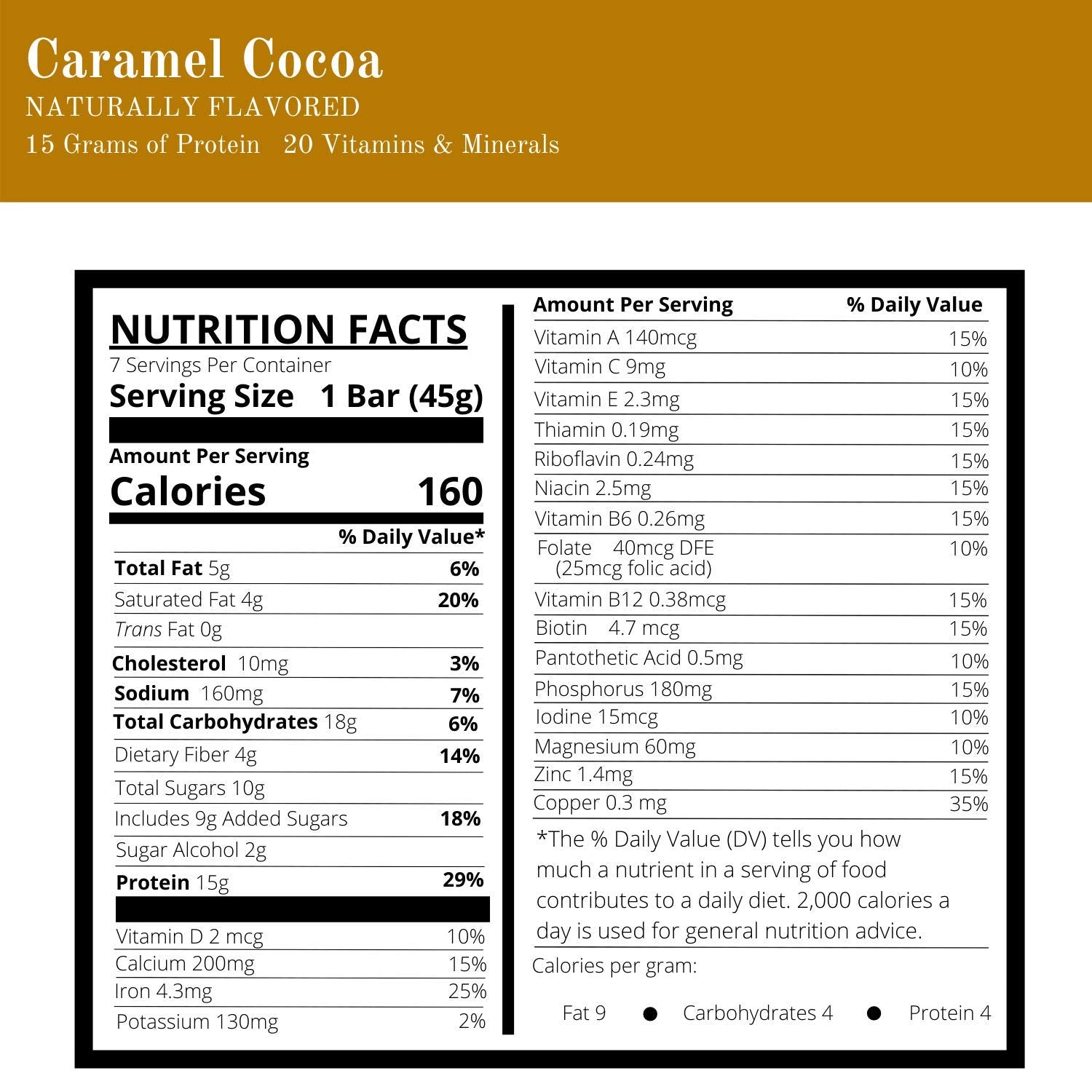 - Unwrap the luxurious blend of Caramel Cocoa Bars, where 15g of protein and just 160 calories come together in a gluten-free delight. These protein bars are a go-to for anyone seeking healthy snacks that don't skimp on flavor.