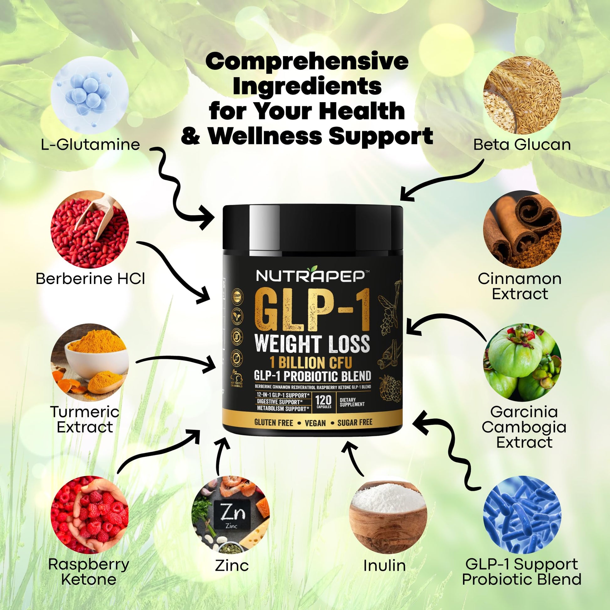 - 12-in-1 Support Formula for Metabolism & Wellness: NutraPep GLP-1 Support Capsules are formulated with 12 carefully chosen ingredients, including Berberine, Cinnamon, Resveratrol, Raspberry Ketones, and Probiotics. This natural blend supports metabolism, promotes digestive balance, and aids weight loss management. It helps balance hunger, supports appetite control, and provides overall wellness. Each capsule supports a healthy gut and promotes metabolic health for a balanced lifestyle.
