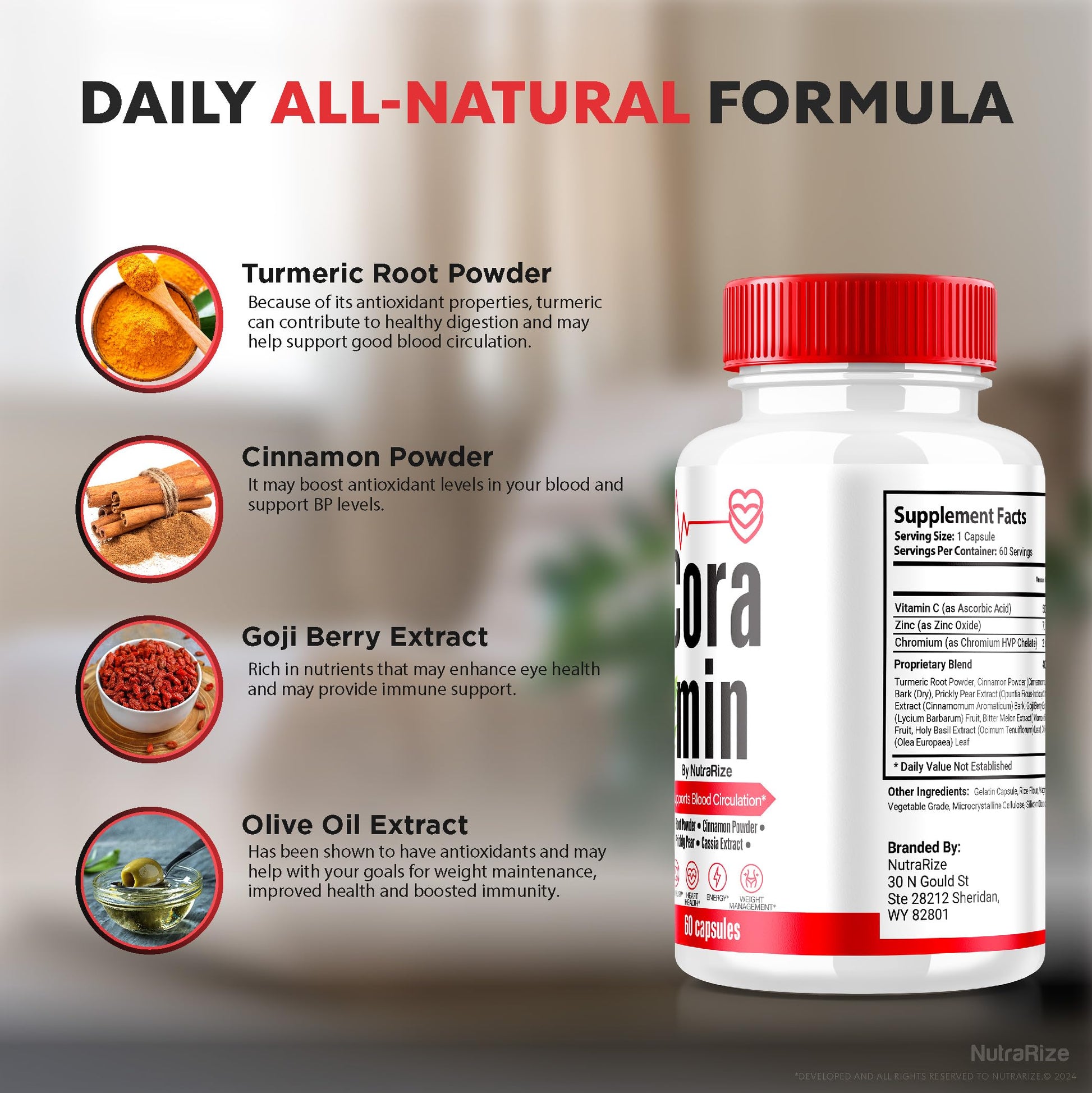 - Natural Dietary Supplement: Embrace the power of nature with Cora min, an all-natural dietary supplement carefully crafted to provide essential support for your health and wellness journey.