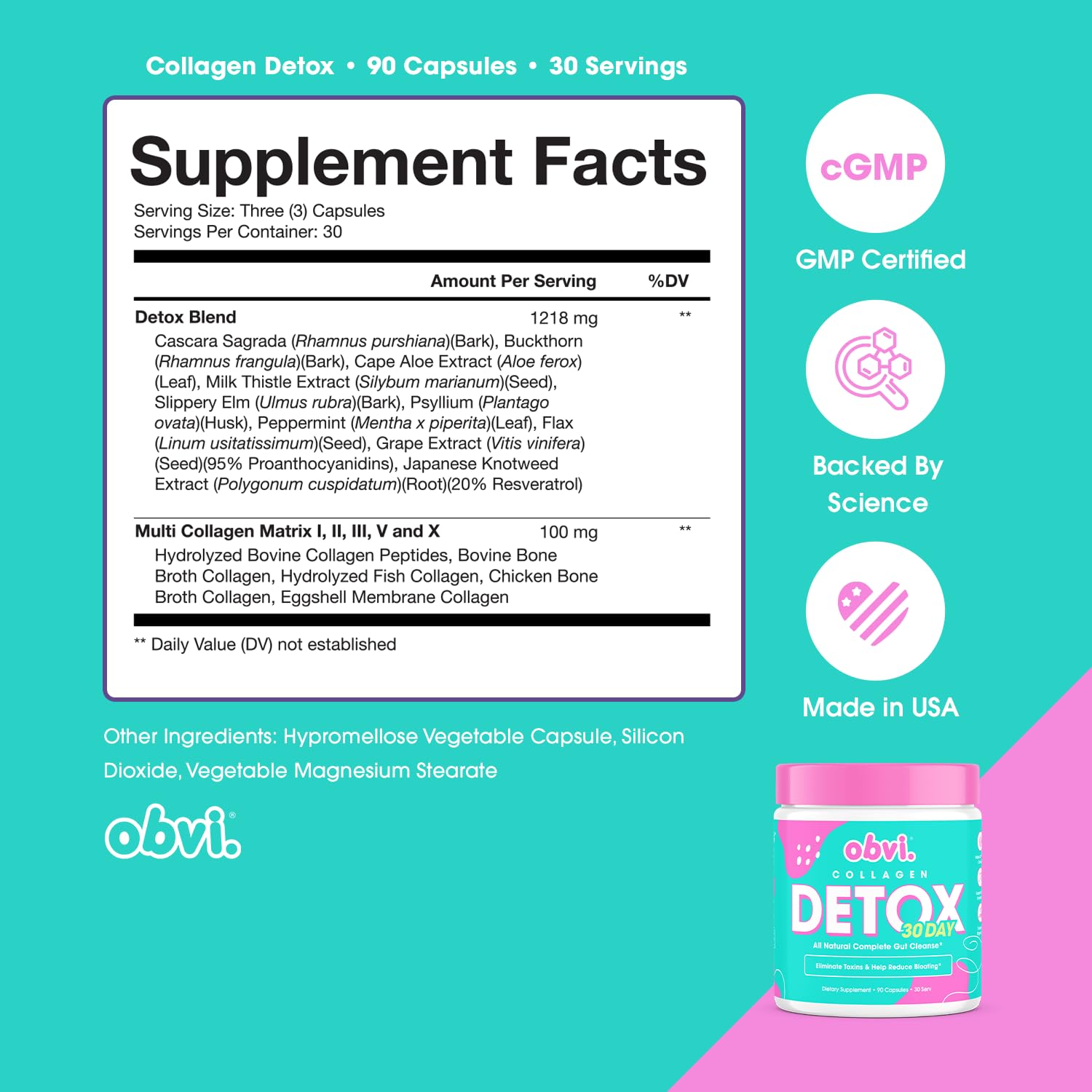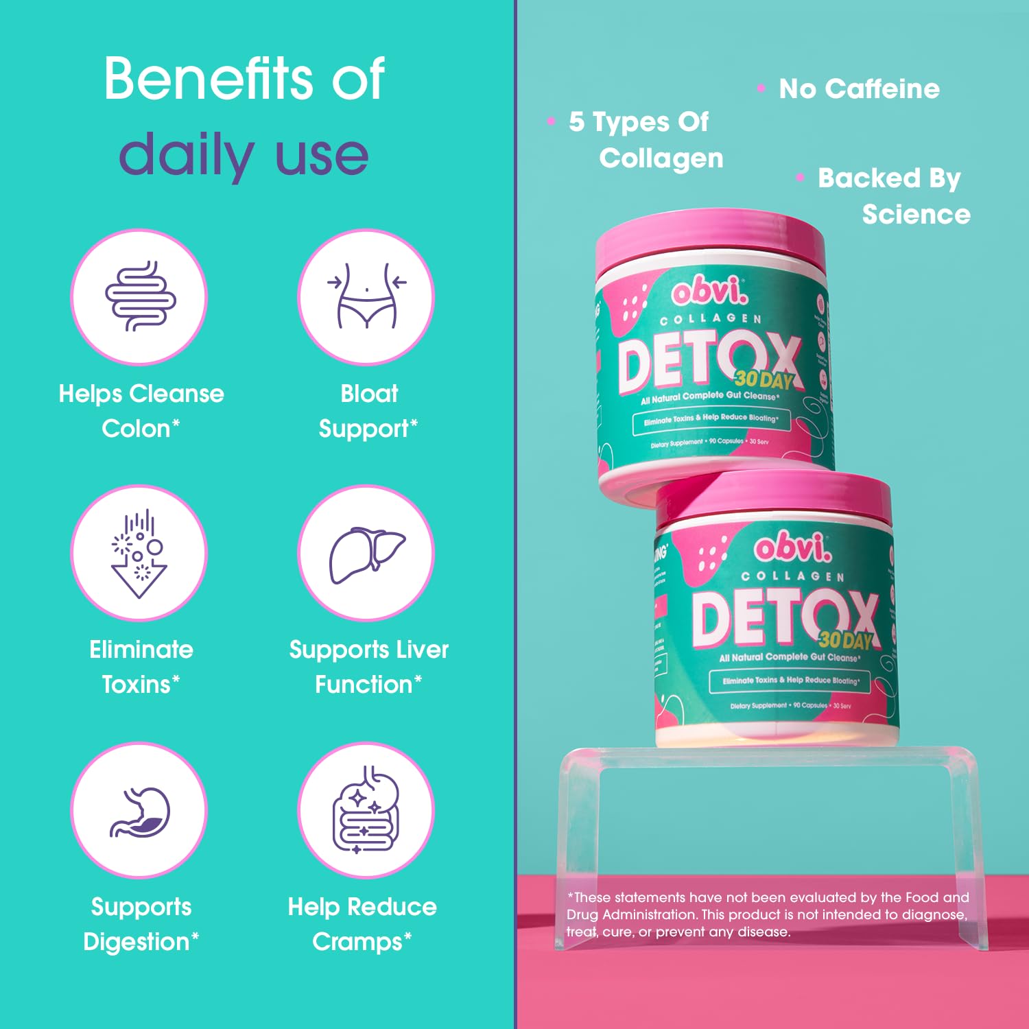 - COLON CLEANSE: Obvi Detox fights impurities that cause bloating. It provides additional benefits, such as cleansing your colon of unwanted harm. With a 30-day system, your organs and stomach will be happy you chose Obvi Detox for a cleaner, healthier you.