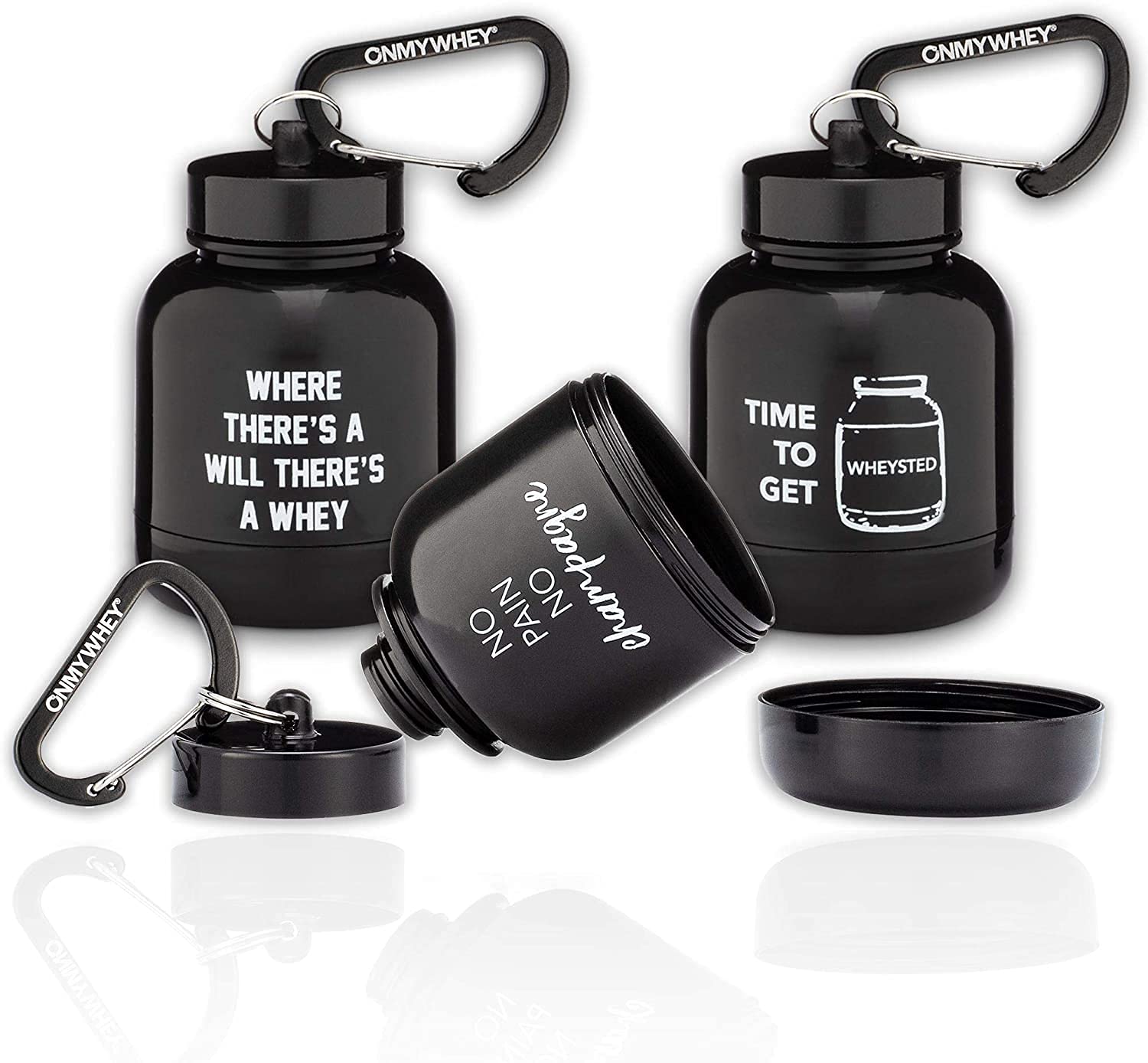 OnMyWhey - Protein Powder and Supplement Funnel Keychain, Portable to-Go Container for The Gym, Workouts, Fitness, and Travel - TSA Approved, Punny Variety 3-Pack