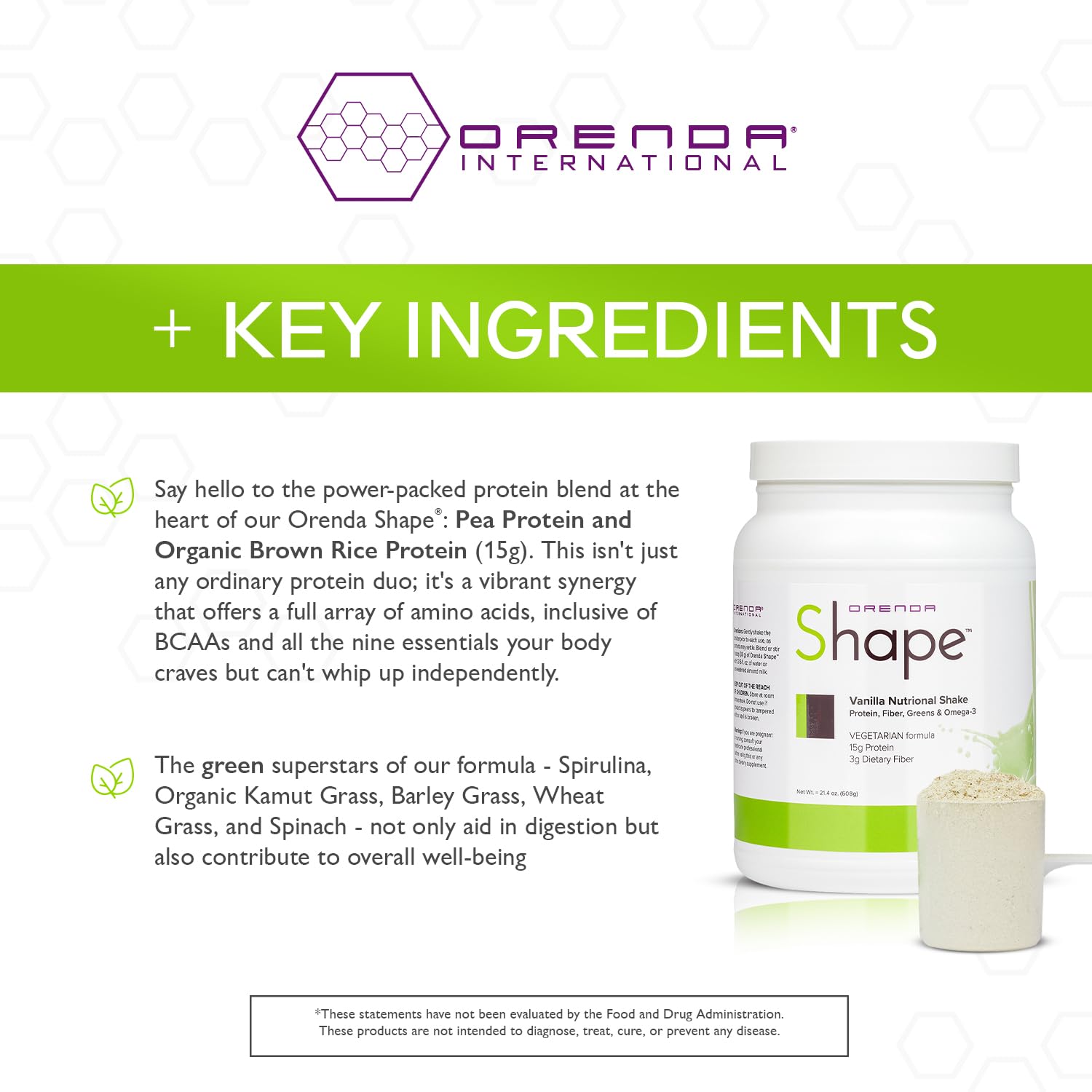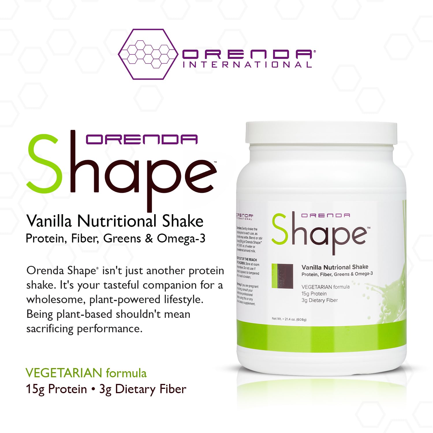 - Recommended intake: As a dietary supplement Gently shake the canister prior to each use, as contents may settle. Blend or stir one scoop (38g) of Orenda Shape with 12-16 fl. oz. of water or unsweetened almond milk and enjoy! Create your own recipes by mixing fruit, vegetables, and ice.