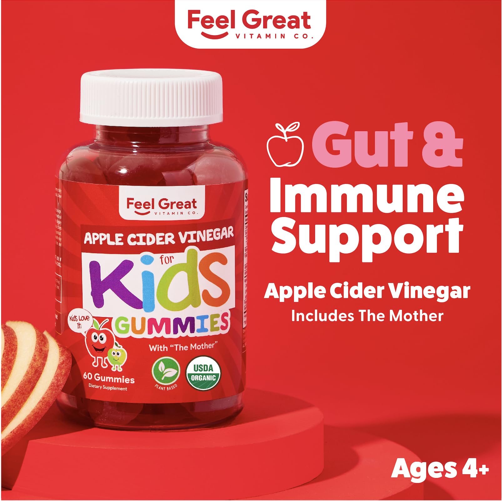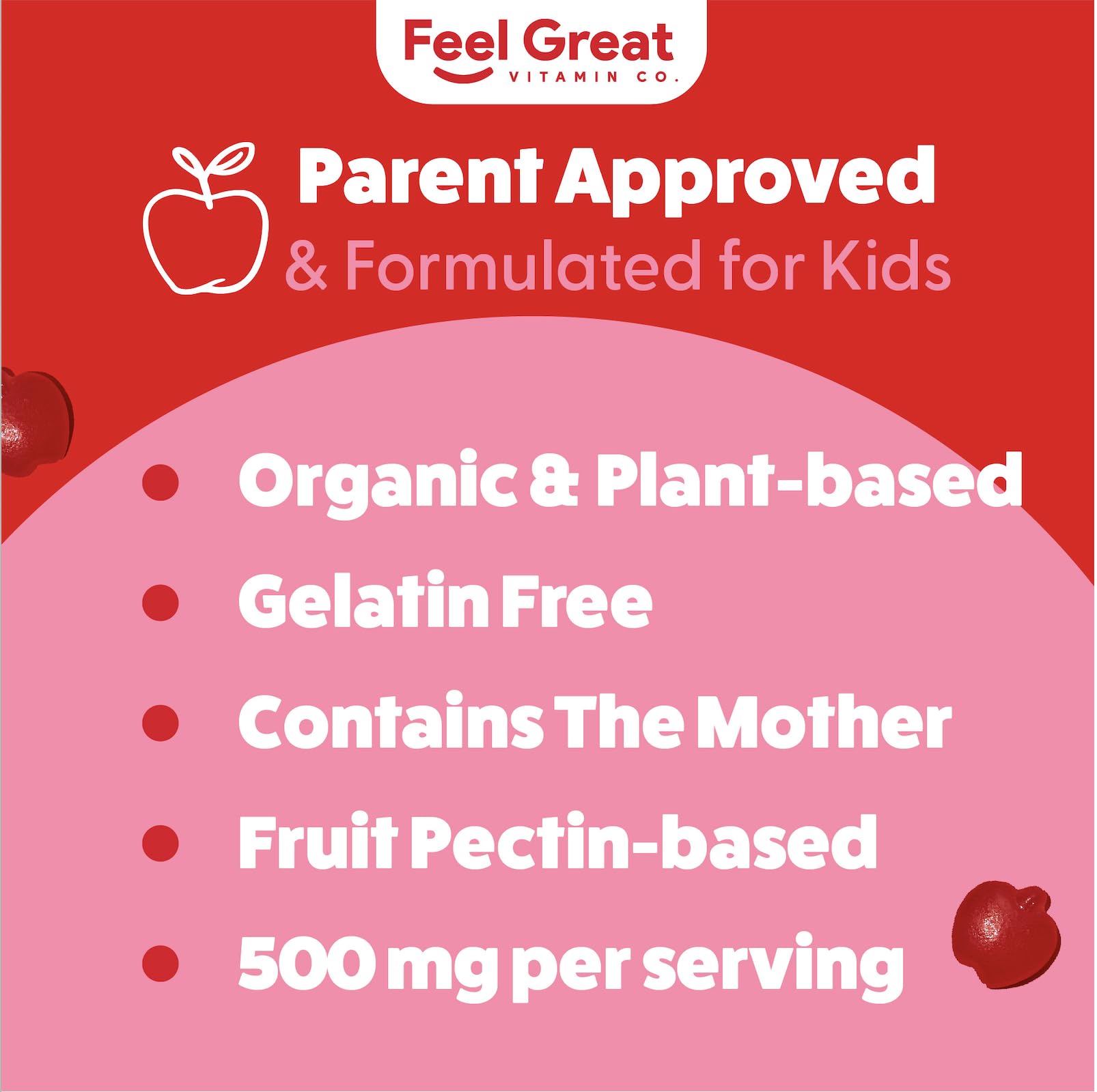 Organic Kids Apple Cider Vinegar Gummies by Feel Great Vitamins | Rich in Digestive Enzymes & Natural Antioxidants for Gut Health | Kids Gummy Supports Healthy Nutrient Absorption | 60 Day Supply
