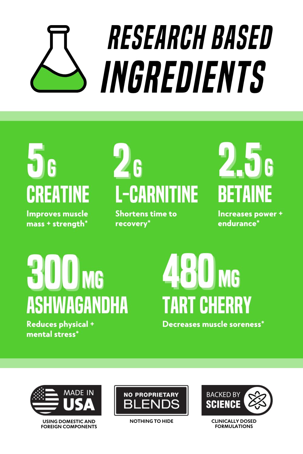 - Backed By Science: Our deliciously flavored post-workout creatine powder for men and women contains ingredients backed by peer-reviewed scientific research at the proper dose to maximize your muscle recovery & recharge your muscles, including Creatine Monohydrate, Betaine, Tart Cherry Powder, and L-Carnitine.