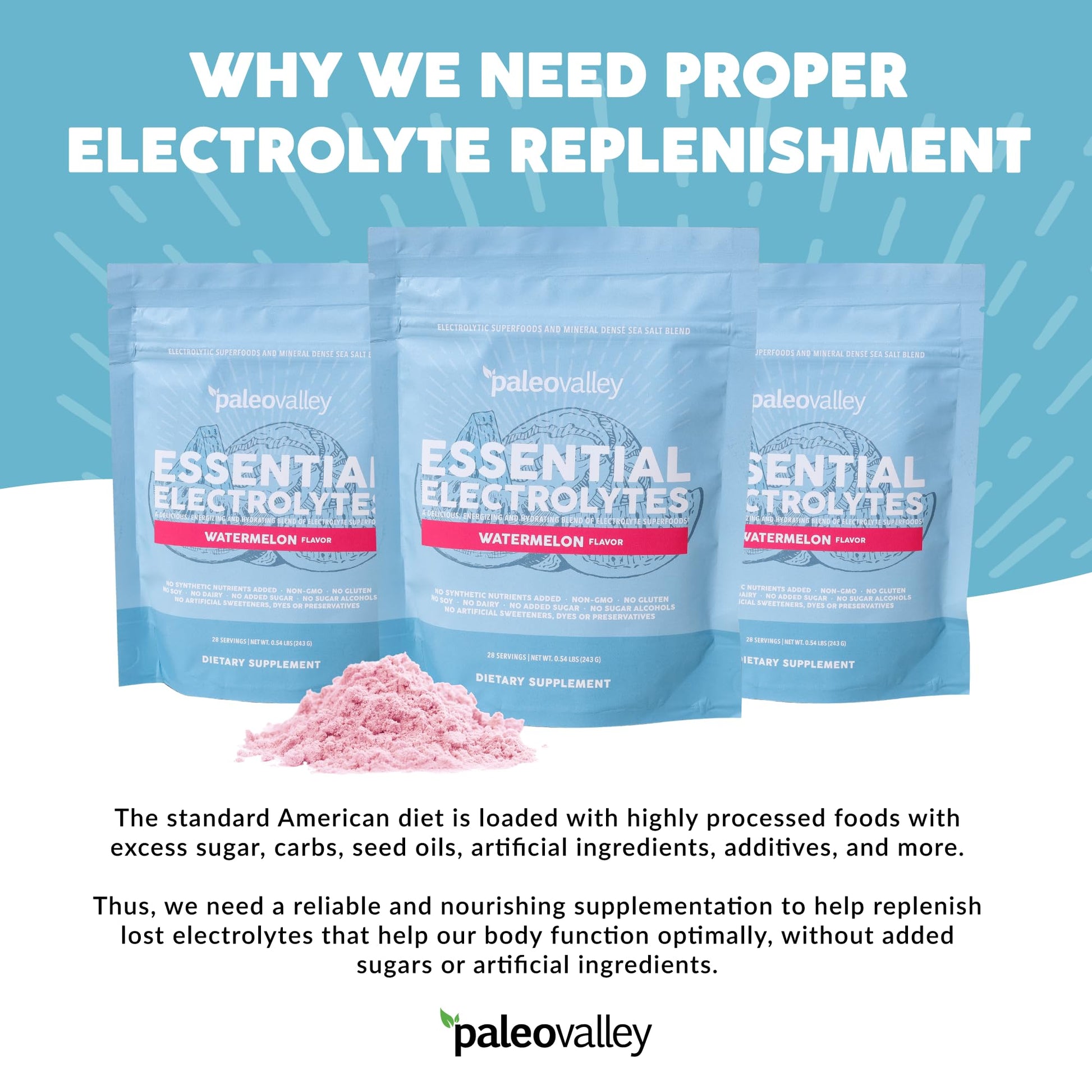 - Full Spectrum Hydration Powder: Boost your hydration levels and support optimal bodily function with Paleovalley Essential Electrolytes. This natural electrolyte powder contains 4 vital electrolytes: sodium, potassium, magnesium, and calcium, enhanced with over 60 trace minerals.